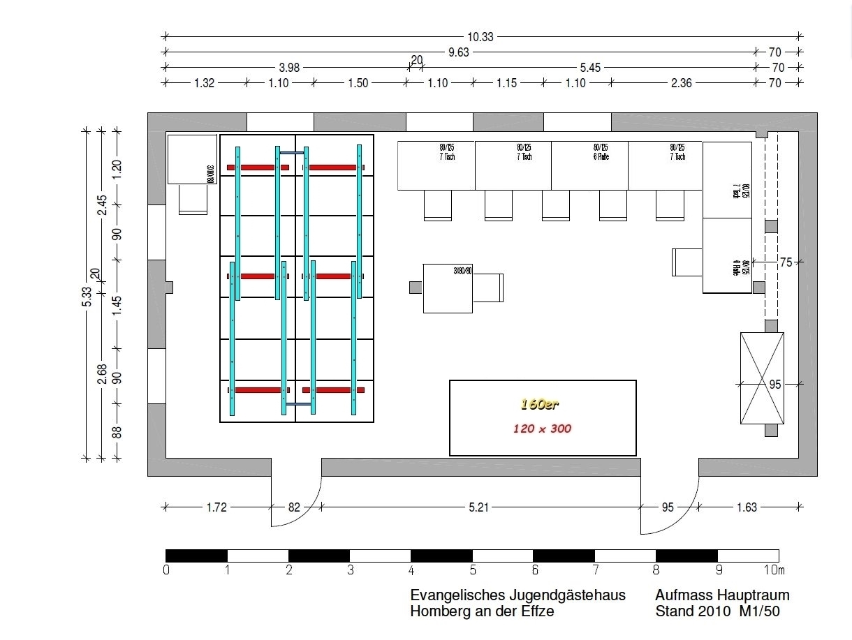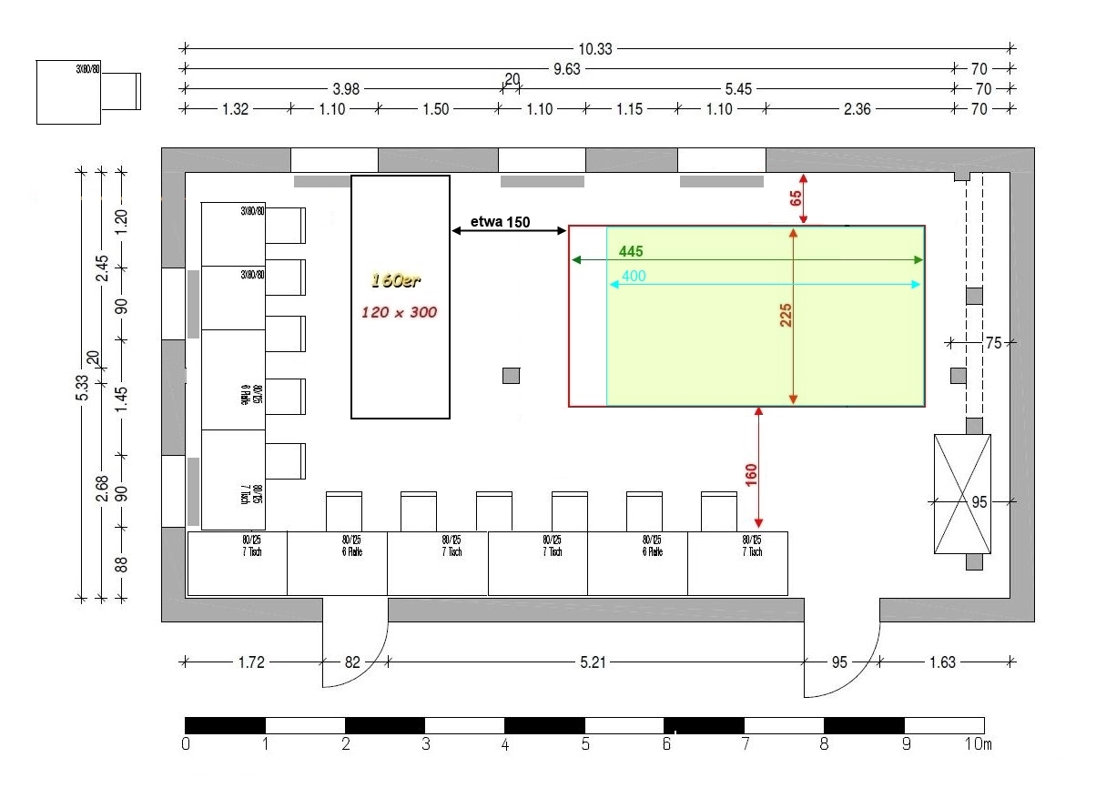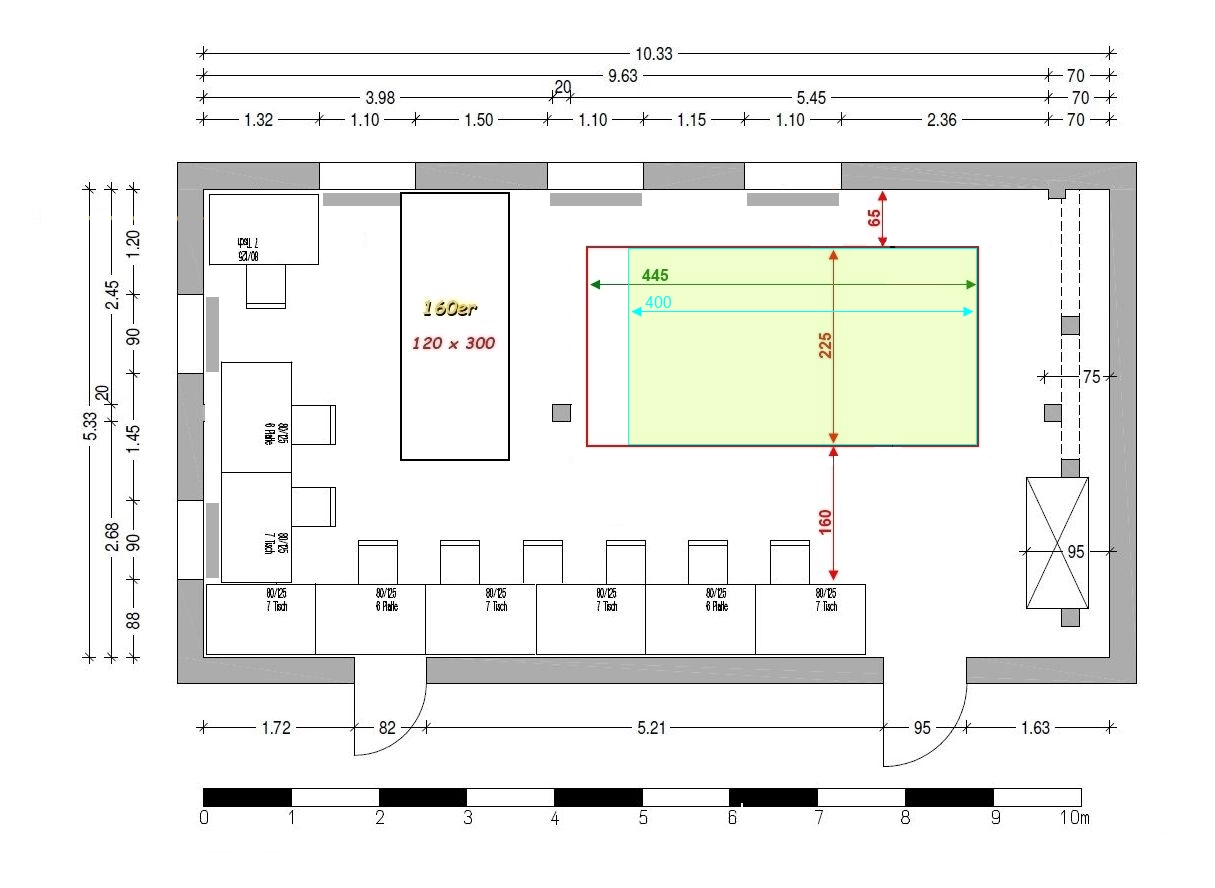 wie wäre es denn die Basteltische wie gaaaaaaaaaanz früher an die obere Fensterfront und um die Ecke bis zum Schrank zu stellen. Die Platte der 140er um 90° drehen und in den Raum links vom Pfeiler und die 160er parallel rechts vom Pfeiler an der unteren Wand?