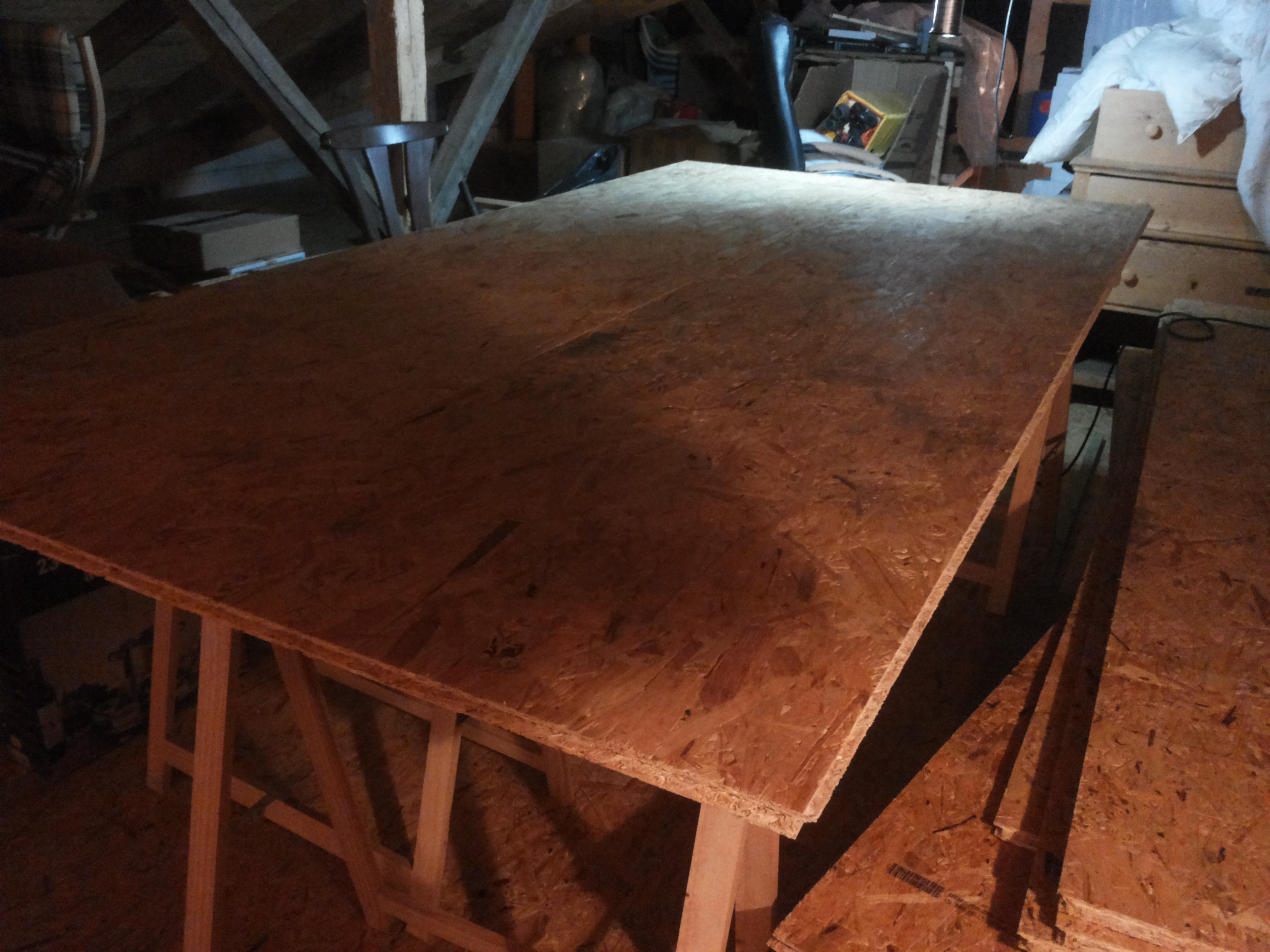 Also die Stabilität der Tapeziertische kannst Du vergessen. Die Lösung mit den OSB-Platten finde ich eigentlich gut, aber 2m lange Platten in Homberg auf den Boden bringen, das wird schweisstreibend. Also wenn, dann lieber mehr und dafür kürzer.