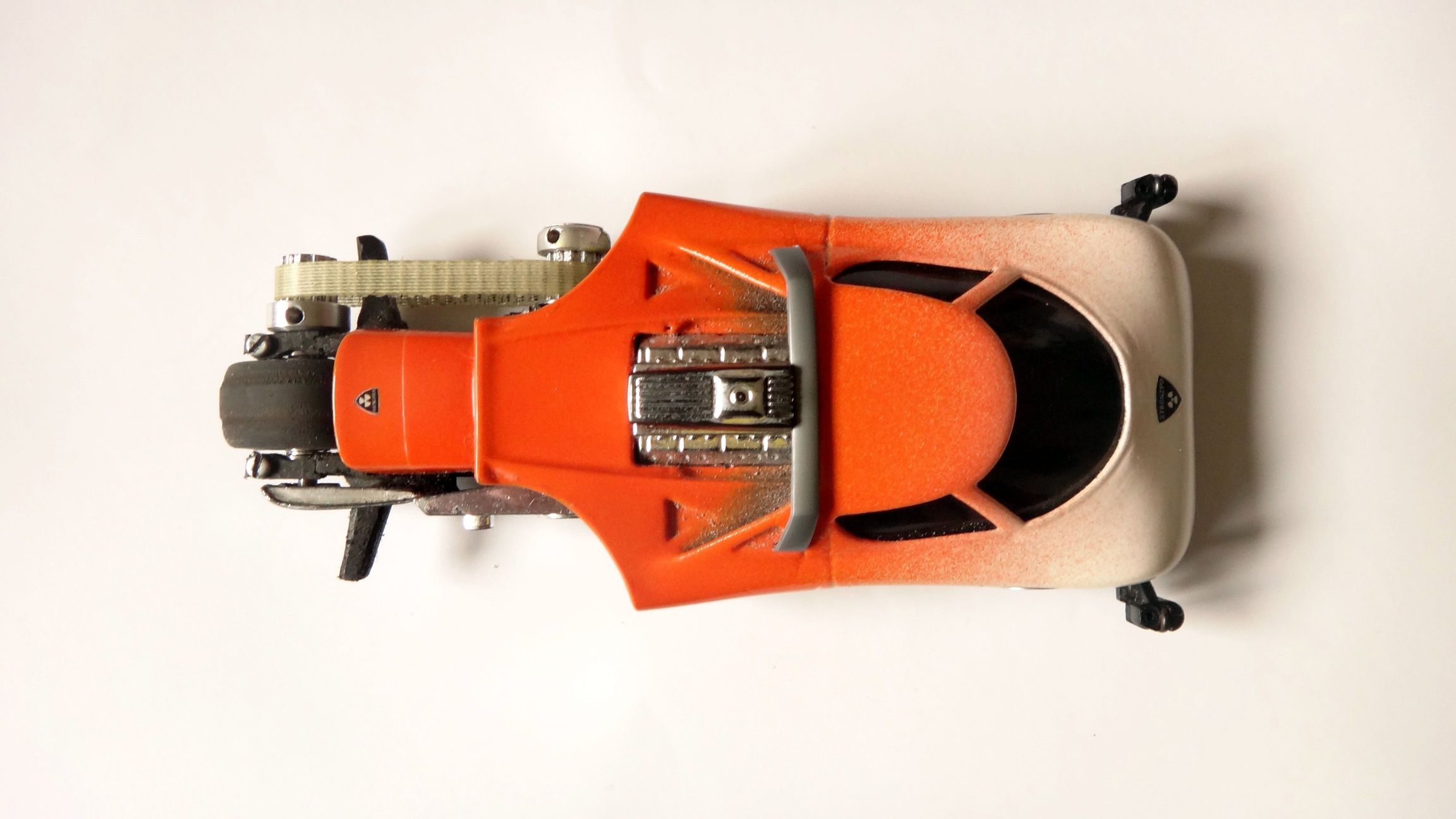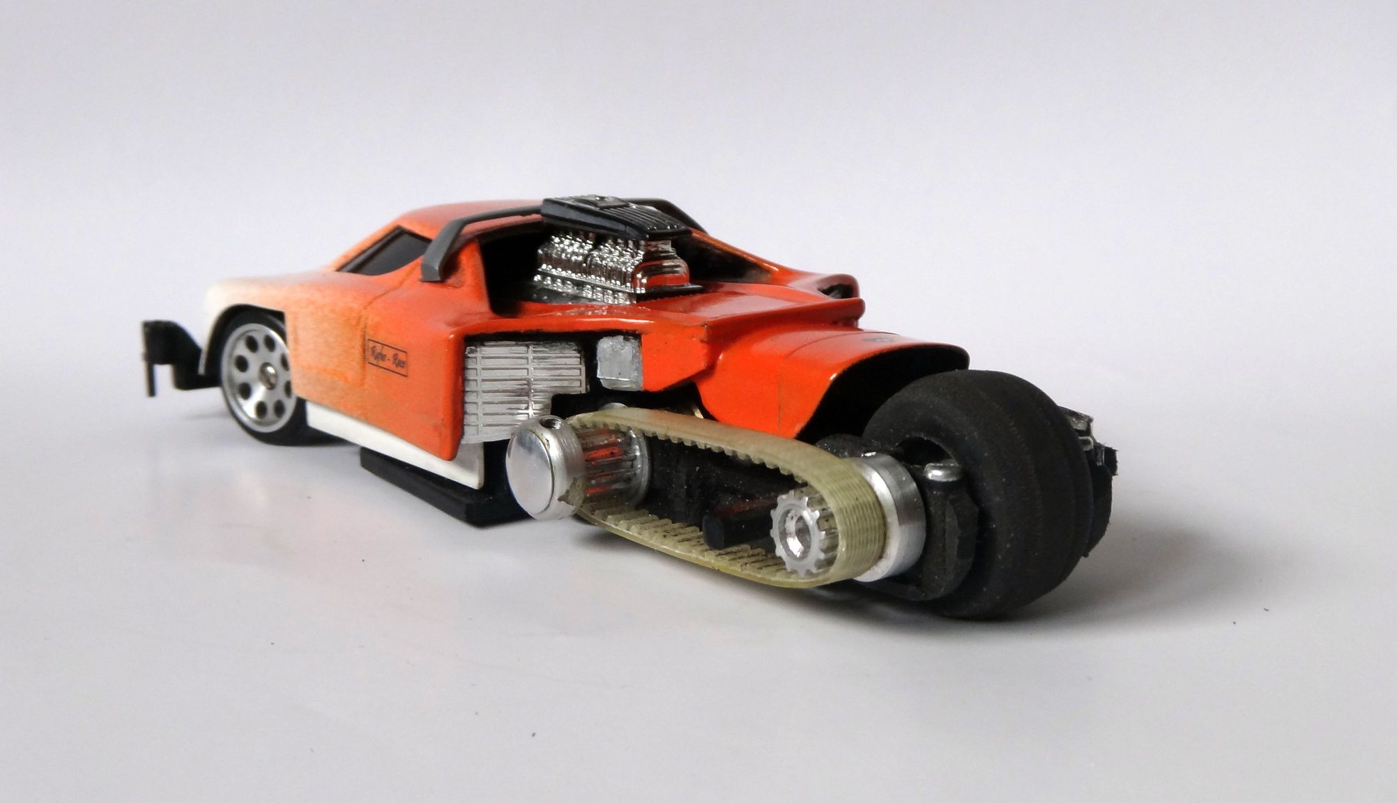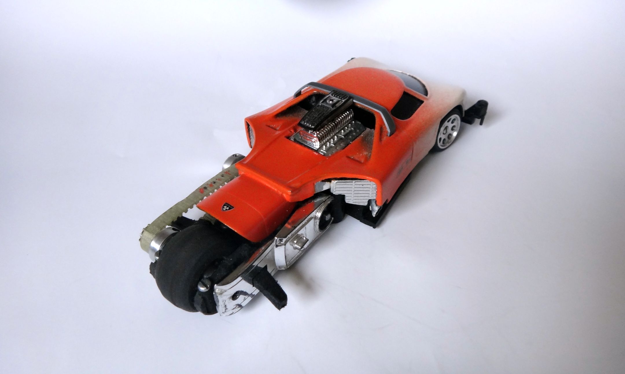 Das eingeklebte verchromte Plastik stammt von einem Revell-Motorrad-Bausatz...die Trittbretter/Fußrasten einer Harley...auch ein Auspuff is dran(rechte Seite unten)