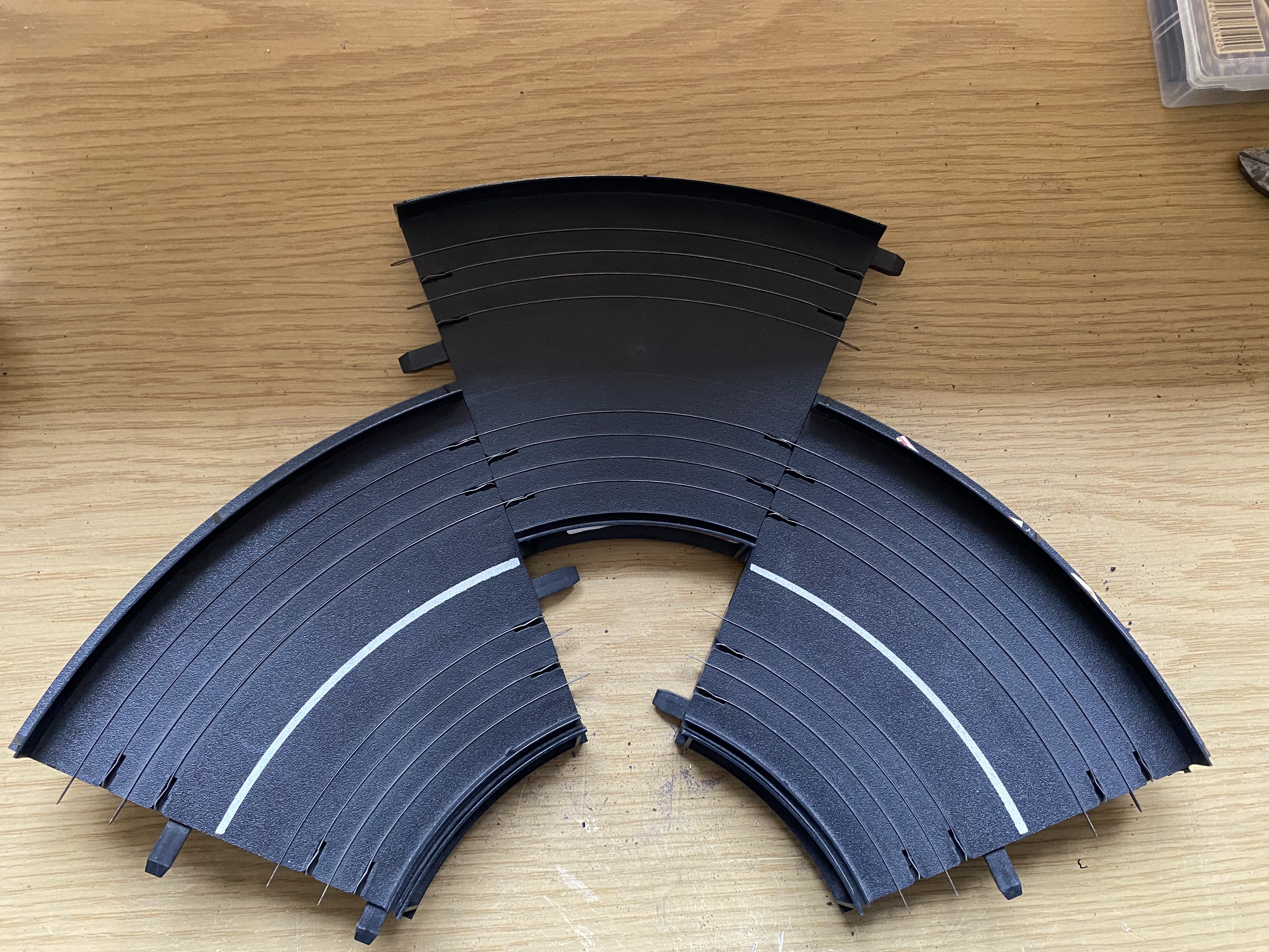 Zwischen die beide aussenradienleitplanken klebe ich die Leitplanke, für die Innenbahn im plusbereich.
