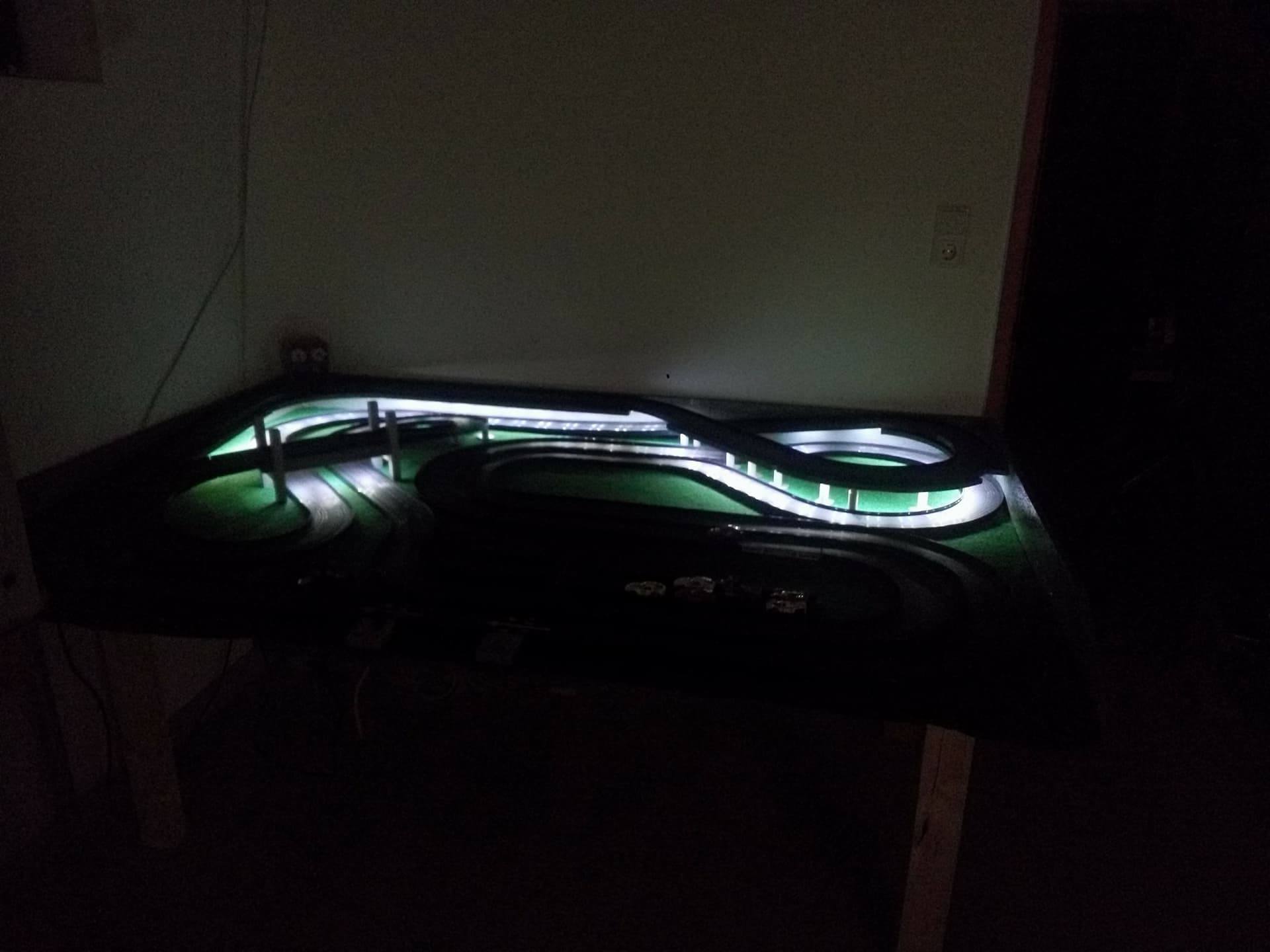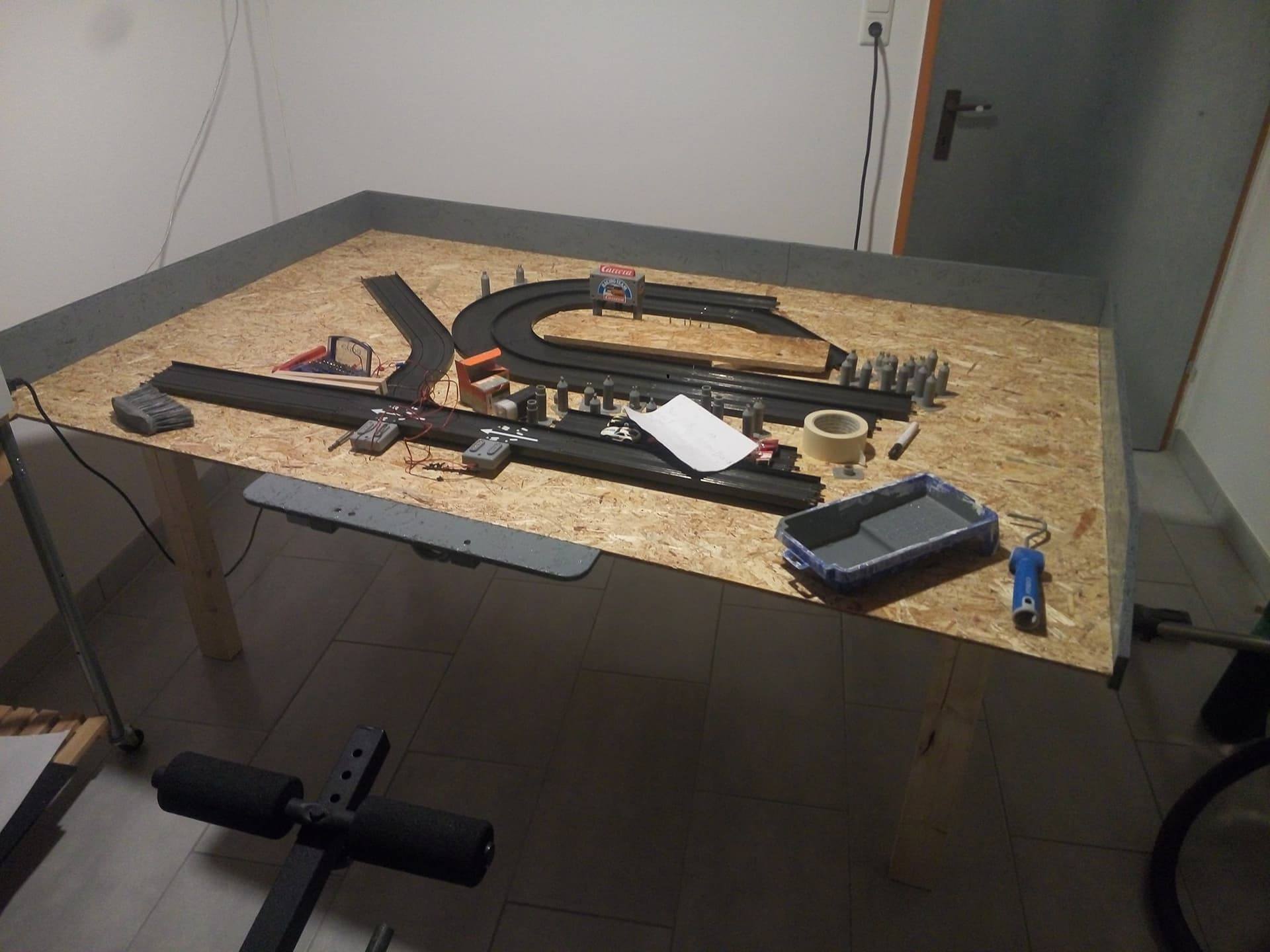 Noch ein kleiner Hinweis zur Bande / Begrenzung deiner Platte. Mach die Banden höher (vor allem dort, wo du in der 2. Ebene fährst) und polster sie. Oder mach noch Fangnetze oben drauf. Und vorne rechts würde ich auch noch eine Abflugsicherung hinbauen. Deine Autos werden es dir danken...