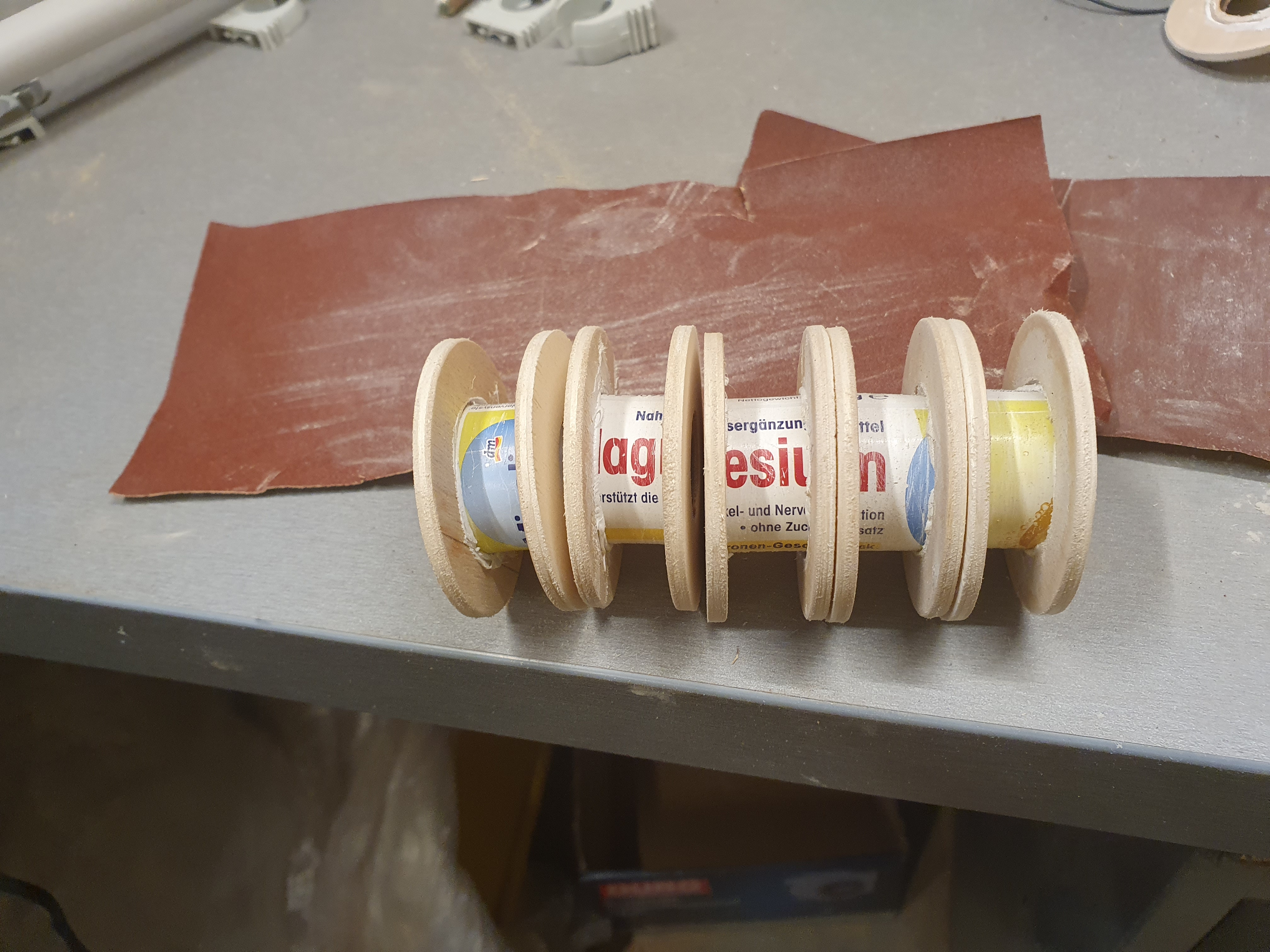 Brausetablettenröhrchen, Laubsägeholz, einen alten Schminkspiegel (bzw. die Halterung), Fränkisches Rohr 20 mm, Bögen zum Fränkischen, alte Wasserhanzuleitung, nen Rest Gewindestange M8, passende Muttern und Scheiben, Möbelfüße 20 mm, Lüsterklemmen (sonst im Haus natürlich alles mit Wago-Klemmen gemacht), Schrumpfschlauch, nen Rest Trockenbaueckleiste, Rest Kunststoffwinkelprofil, Kartuschenbaukleber, Ikea-Schrank-Wand-Winkel, Gedöns...