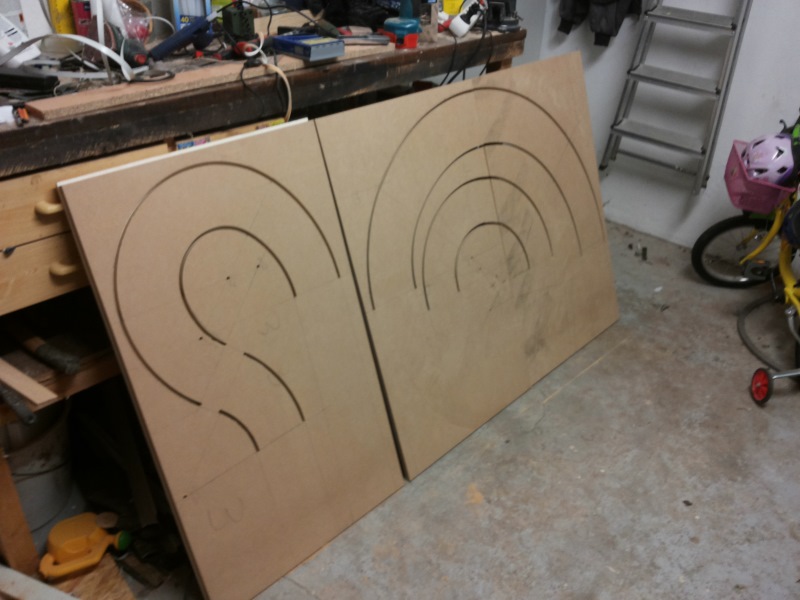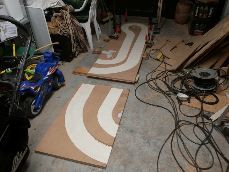 Für die restlichen zwei Module sind die Innenführungen schon angezeichnet, muss ich morgen nur kurz drüberfräsen, das geht ganz fix. Dann sind die Geraden dran. Liege also (noch) gut in der Zeit. Bis Samstag sollen alle Platten geleimt sein... MO GUGGE.