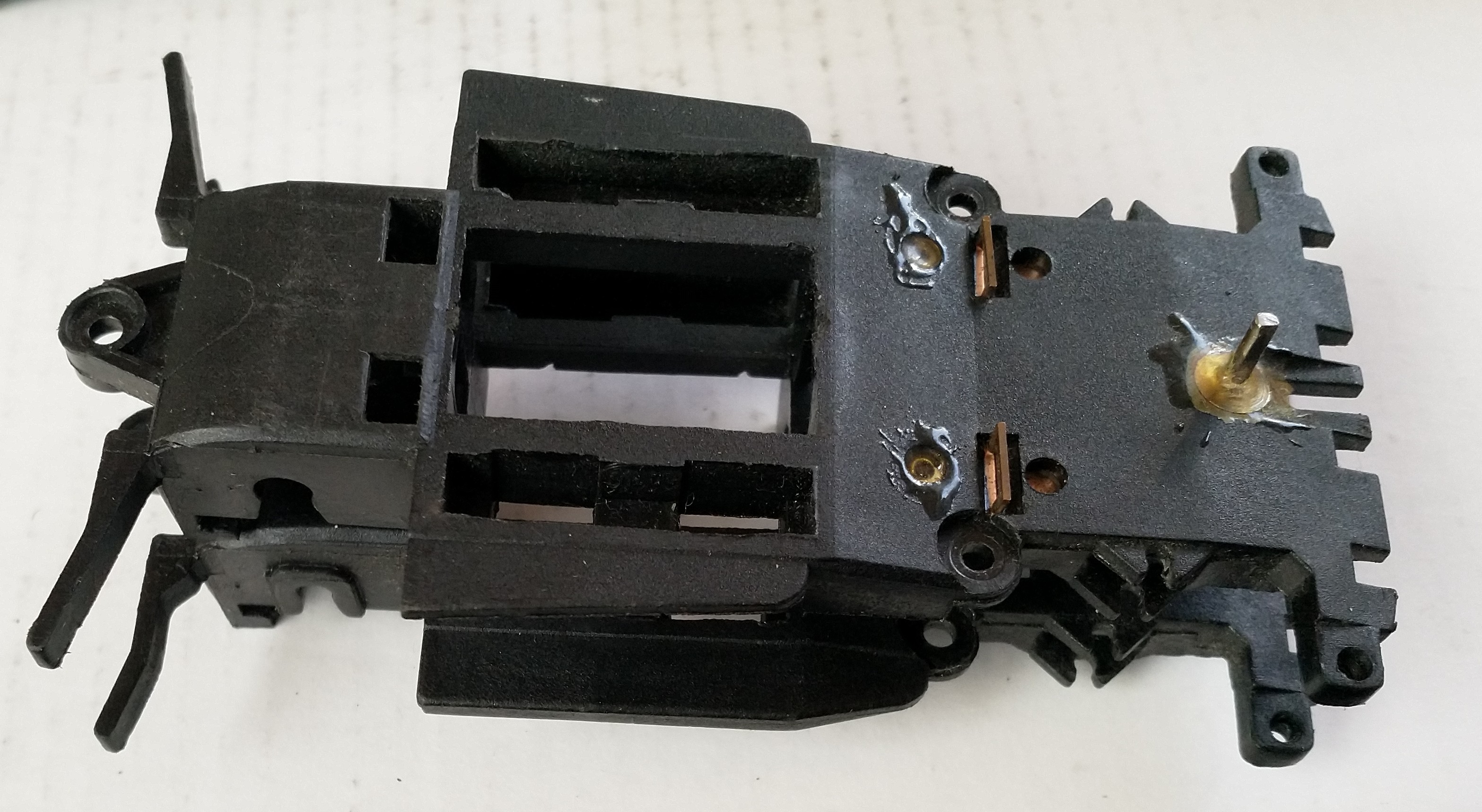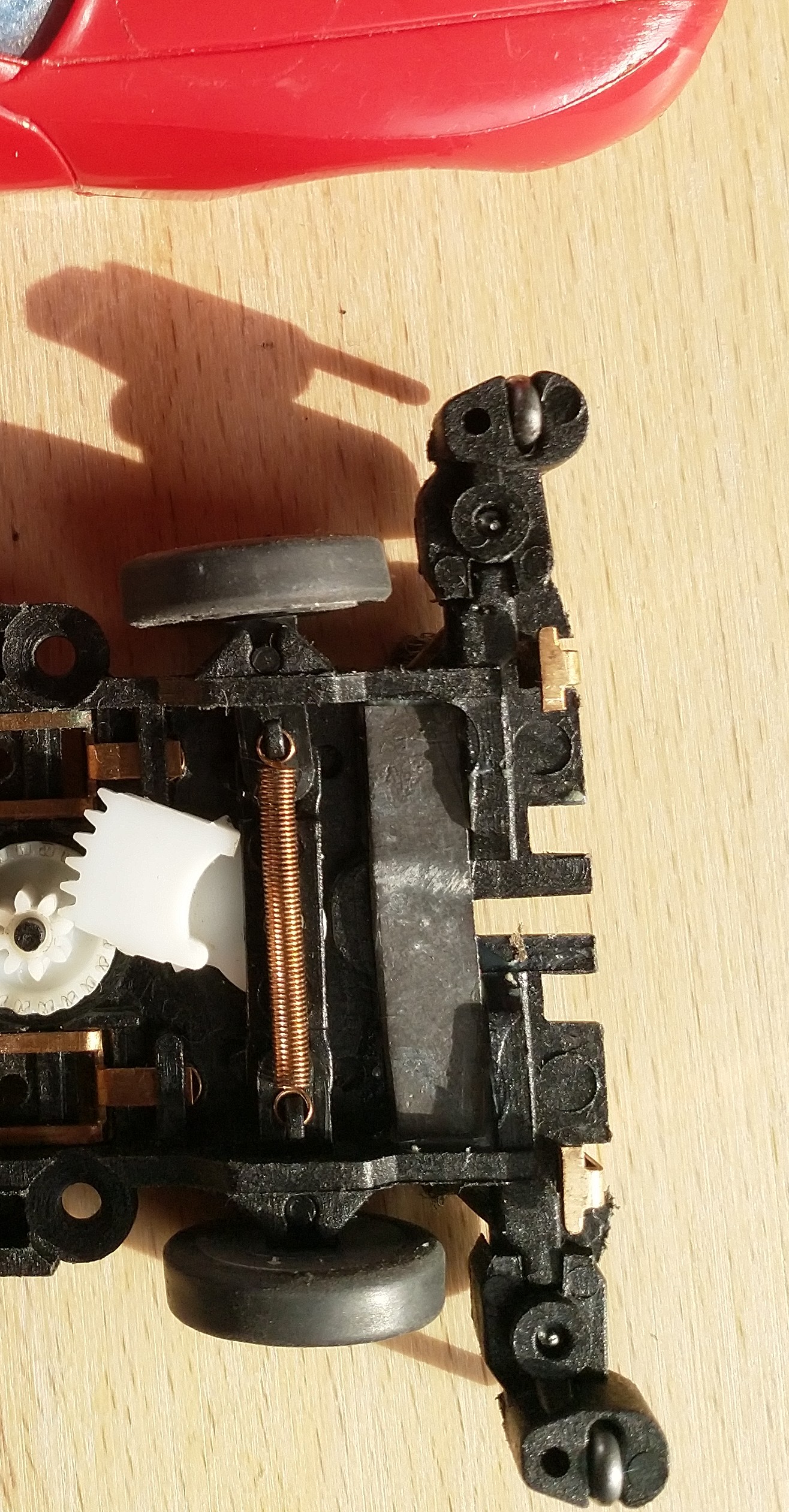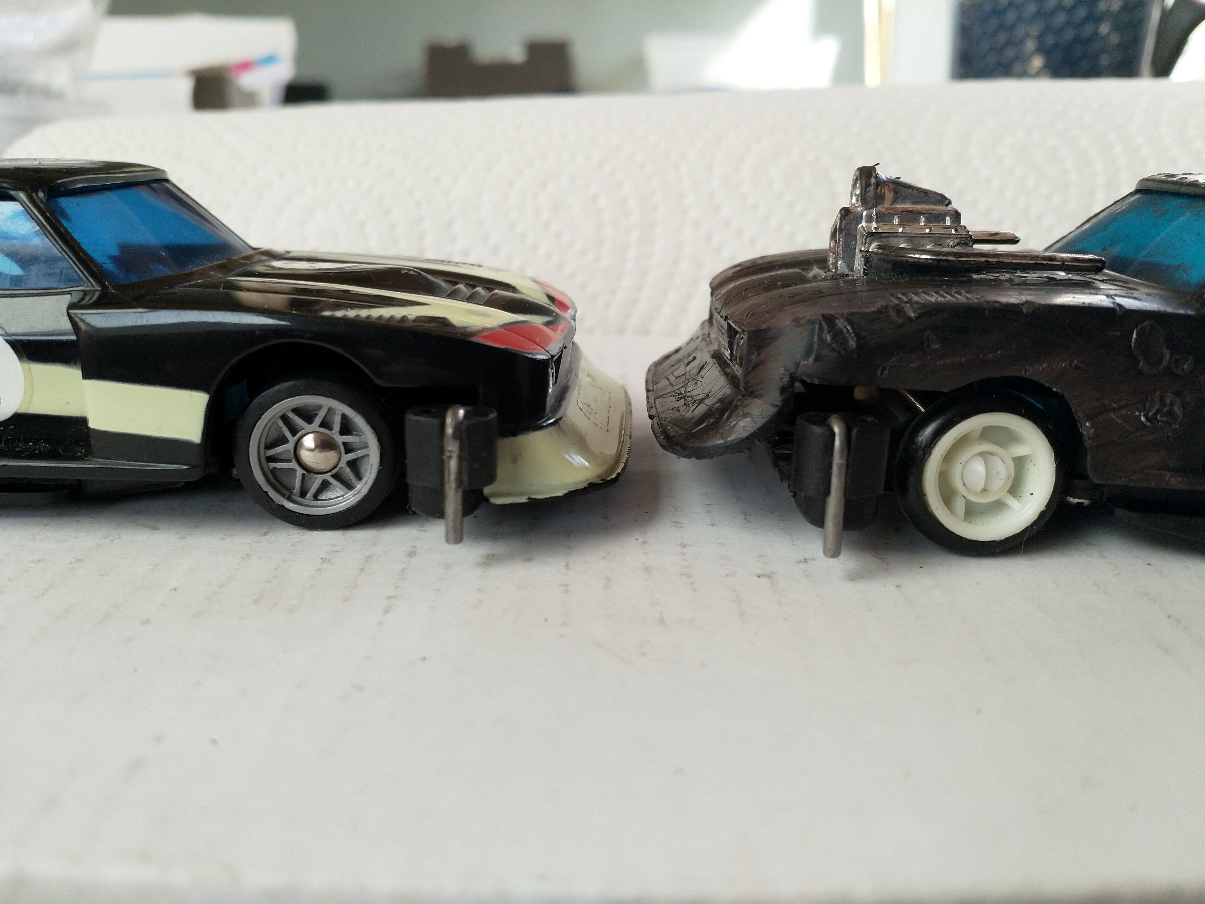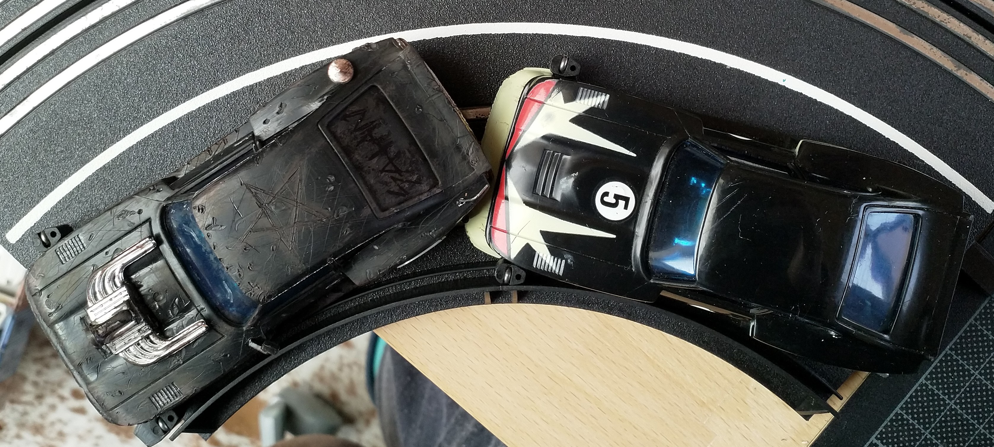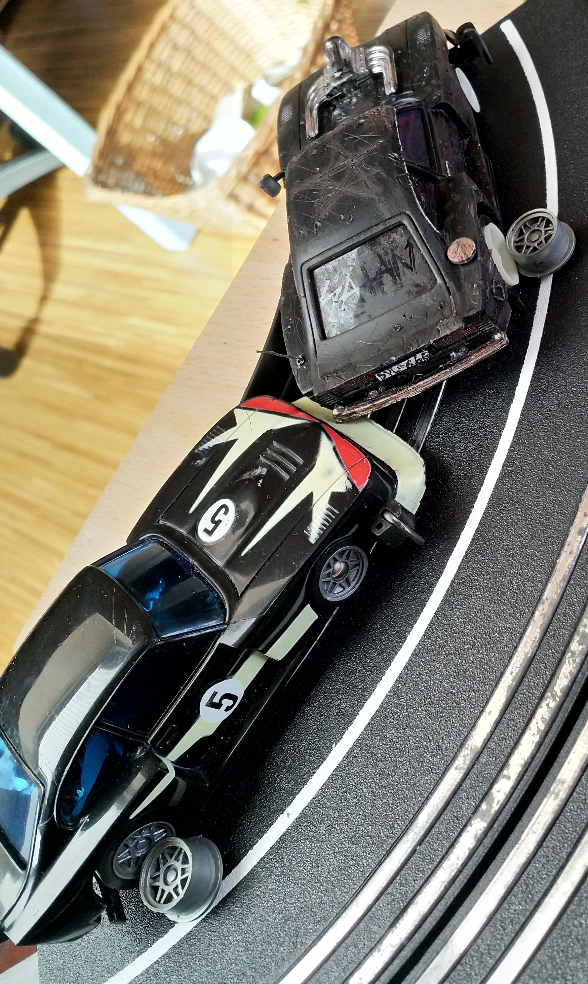 Habe jetzt den Frontspoiler (auf dem Foto ist eine Seite vorher und eine nachher) seitlich bearbeitet damit er nicht mehr vor dem Führungshorn auf die Innenführung trifft und die Karosse auf ein letzte Generation V1 Chassis gebaut. Dadurch ist die Karosse höher als die Innenführung. Habe aber das Gefühl diese Chassis sind irgendwie unbrauchbar durch die geänderten mittigen Abstandsflügel, und die größeren Felgen mit breiter Spur. Die älteren Chassis schaffen eine bessere Tangente. Anhand der Felgen sieht man es gut.