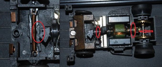 Eine Möglichkeit, dass zu verbessern ist, die Federn unter den Schleifern etwas zu dehnen. Dadurch wird der Anpressdruck der Schleifer an die Halterung vergrößert und damit die Stromaufnahme verbessert. Nachteil: Durch den größeren Druck wird das Fahrzeug quasi von der Bahn gehoben, sprich die Vorderräder haben schlechteren Kontakt. Das kann dazu führen, dass die Fahrzeuge nicht mehr so gut lenken. Dann müsste der Lenkeinschlag vergrößert werden. Führt wiederum evtl. dazu, dass die Fahrzeuge wieder langsamer werden…