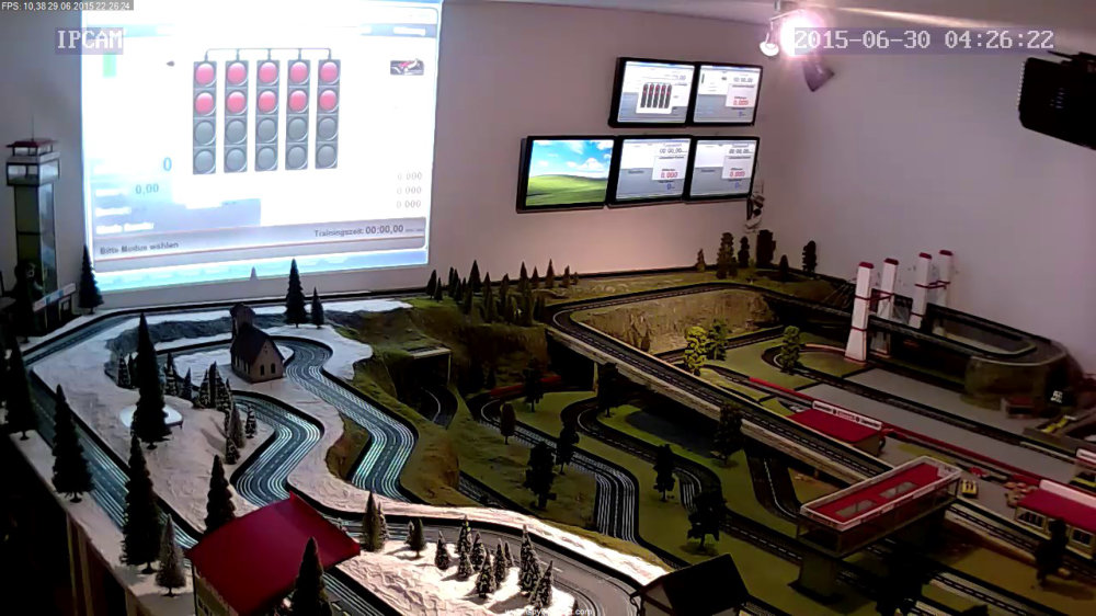 Über den Beamer sollen nur die Hauptinformationen, wie die aktuelle Rundenzeiten der beiden Fahrer und der eingestellte Rundenrekord angezeigt werden. Bin mit der Gestaltung noch nicht ganz fertig. Auf zwei Monitore werden jeweils die Detailinfos der Fahrer A und B angezeigt. Auf den beiden anderen Monitoren sollen die Werte für zwei optionale Hindernissfahrzeuge angezeigt werden und der letzte Monitor gibt das Bild der USB-Tunnelkamera wieder.