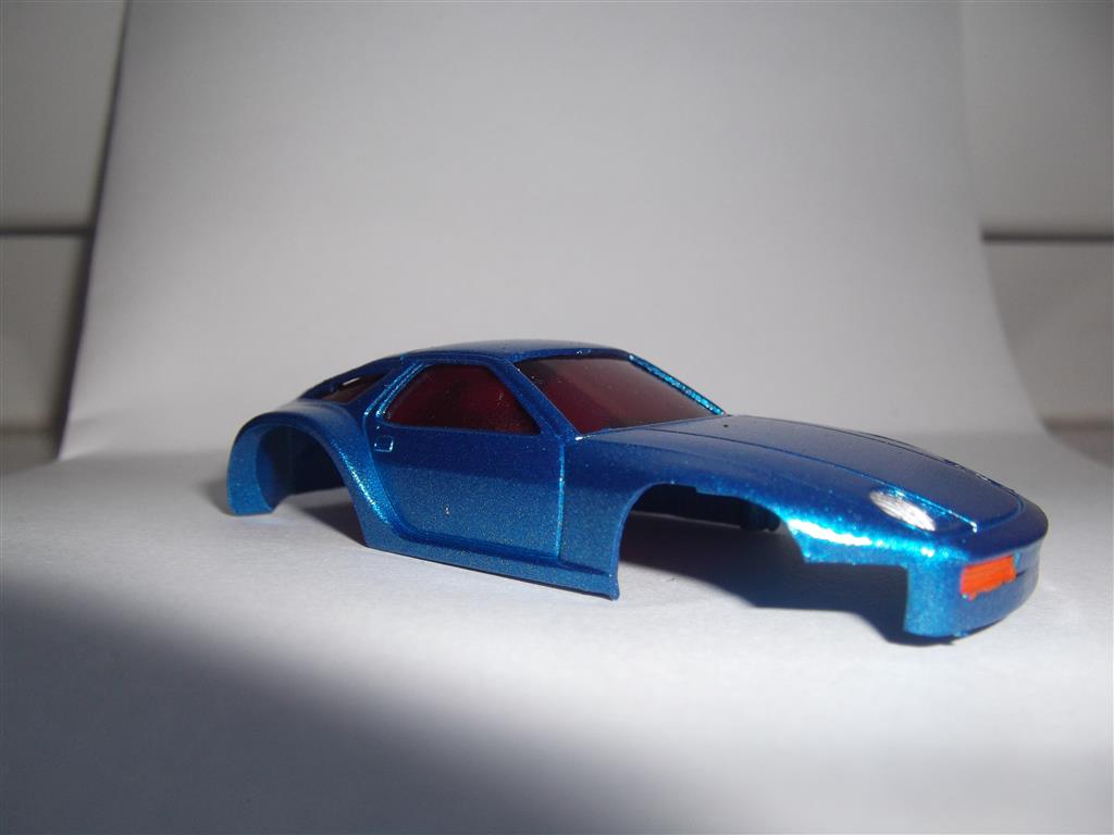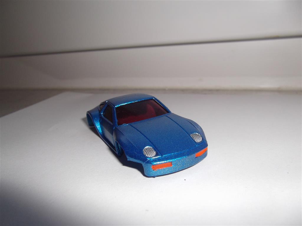 Einen Porsche 928 habe ich blaumetallic lackiert mit roten scheiben. Die Frontscheinwerfer silber, Blinker vorne Orange und Rücklichter Rot. Decals fehlen noch, und die Reifen für die Felgen mit Steg.