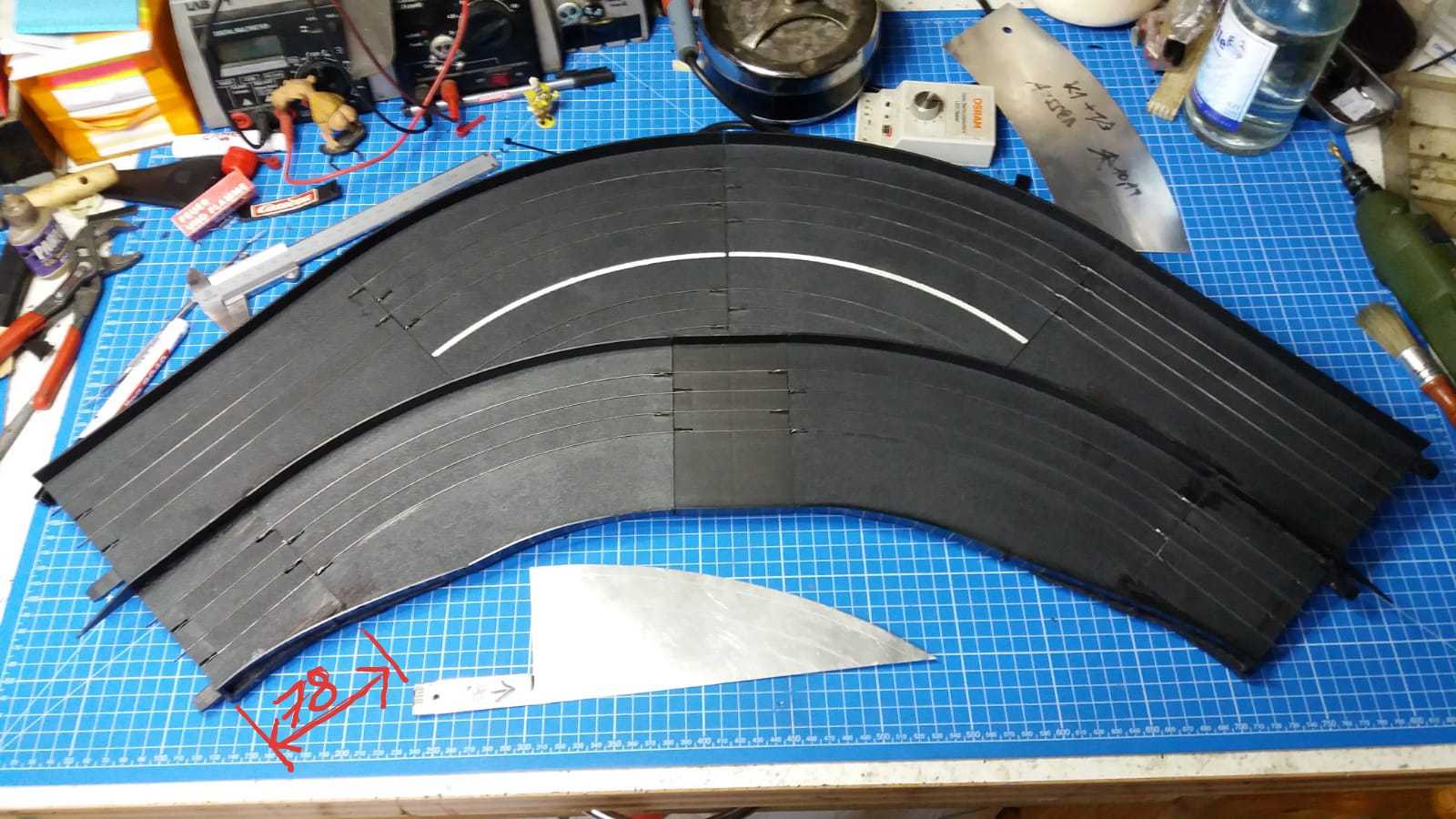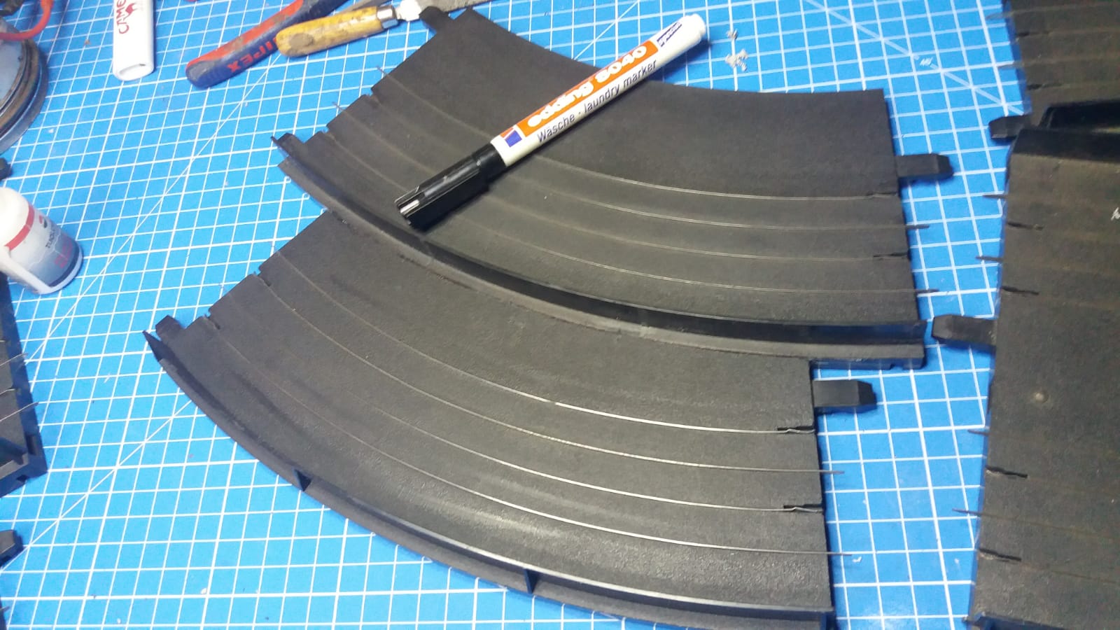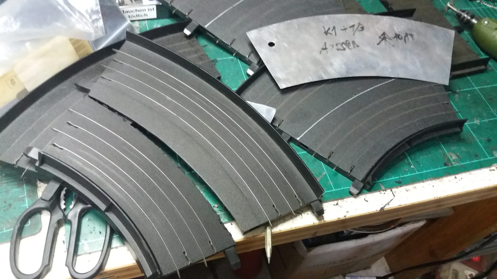 Geht flott mit Schablone, nur ein Schnitt an der Aussenschiene...die innere Schiene wird nur abgebrochen an der Leiterbahn...und ne 1/3 Gerade zu teilen is auch ne leichte Übung.