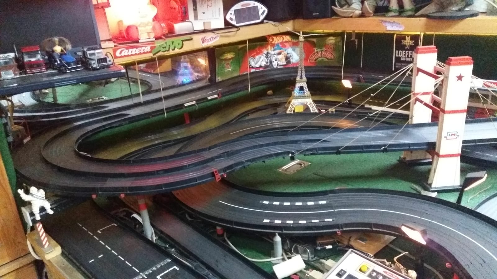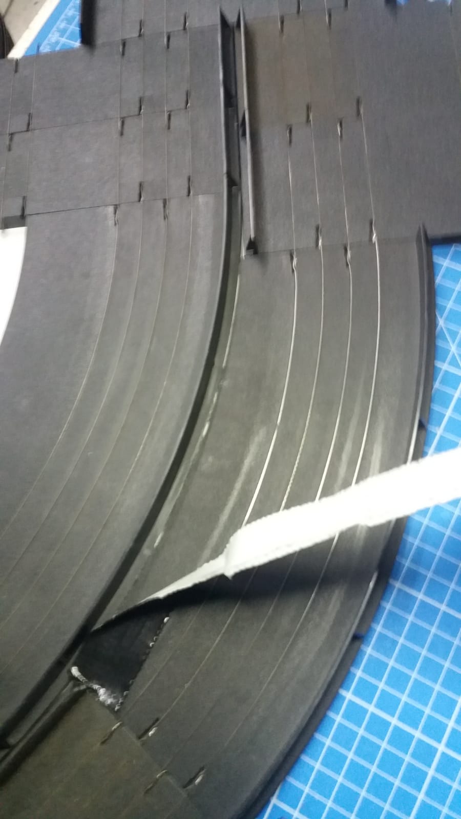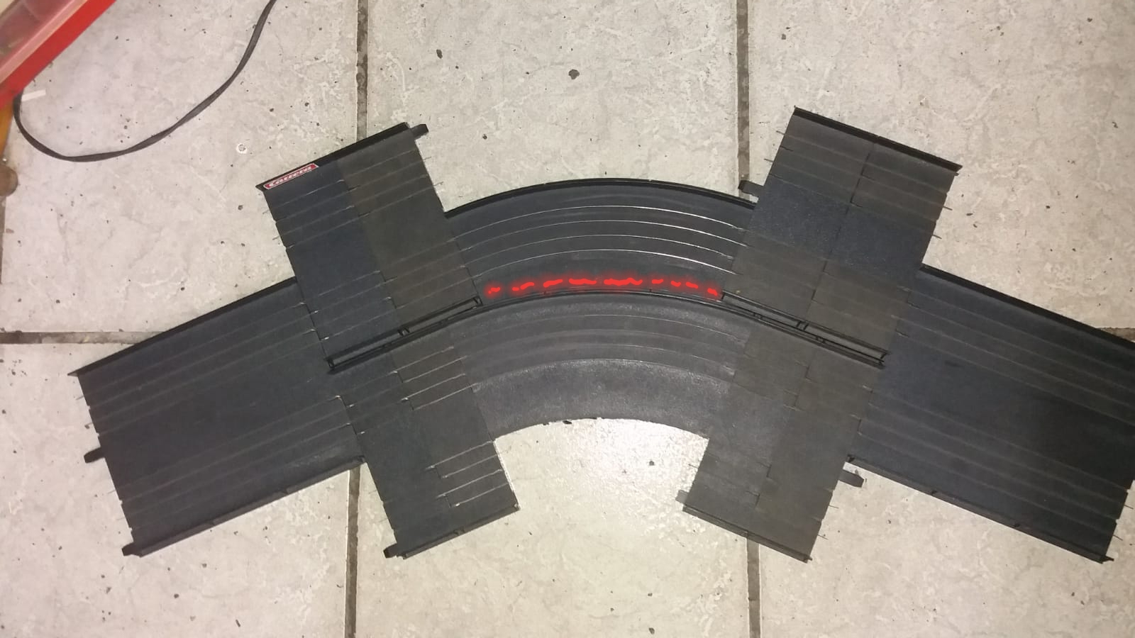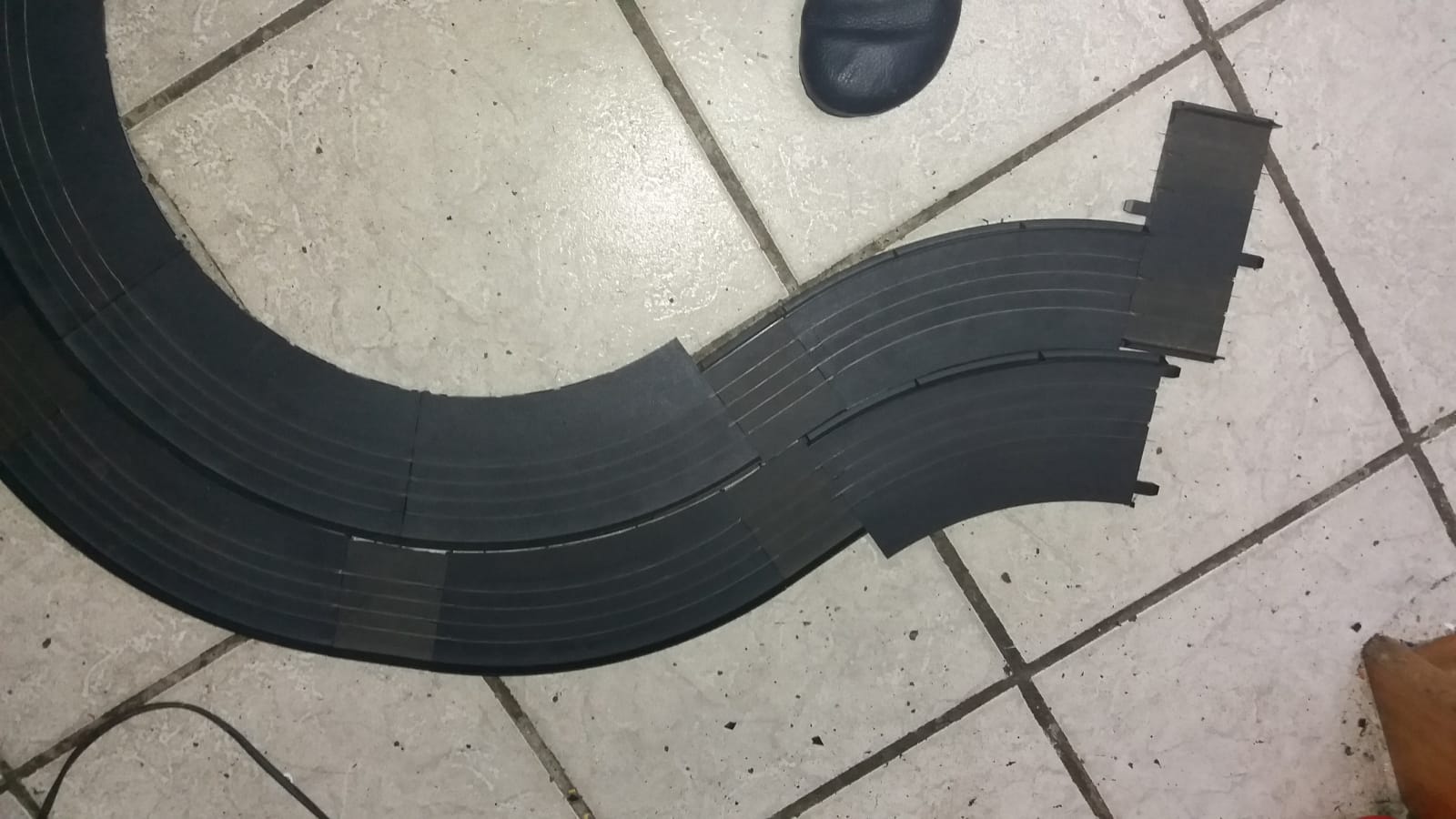 ..die innenliegenden Aussenkurven hab ich an der äusseren Leiterbahn der inneren Spur abgebrochen...geht ruckzuck. Nur zusammengelegt...kleine Abweiser fehlen auch noch, sowie die kleinen Stützstreben