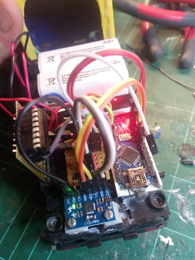Als Herz kommt diesmal ein Arduino Nano zum Einsatz, weil ich mehr Ein- und Ausgänge, mehr Rechenleistung, und einen USB-Anschluss brauche: Zwei Akkus in Reihe sind wegen Standard-Motor und Hindi-Getriebe nötig, Gewicht ist ja gottseidank egal.
