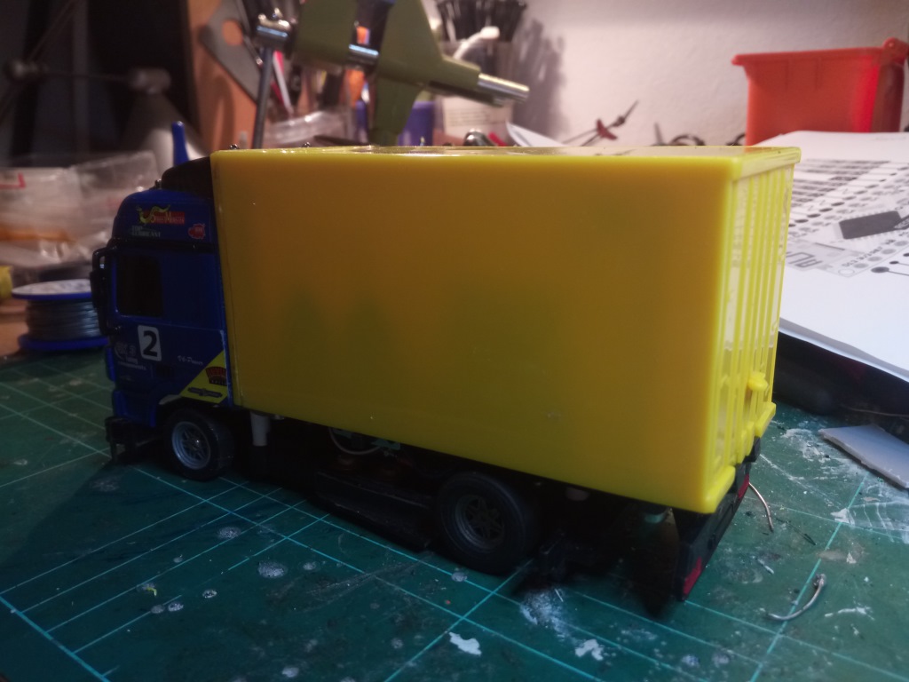 Karosse sieht (oder sah zuerst) so aus: Front ist vom Dickie Racing Truck, hinten ist ein zersägter Dickie-Auflieger zum Koffer verarbeitet worden.
