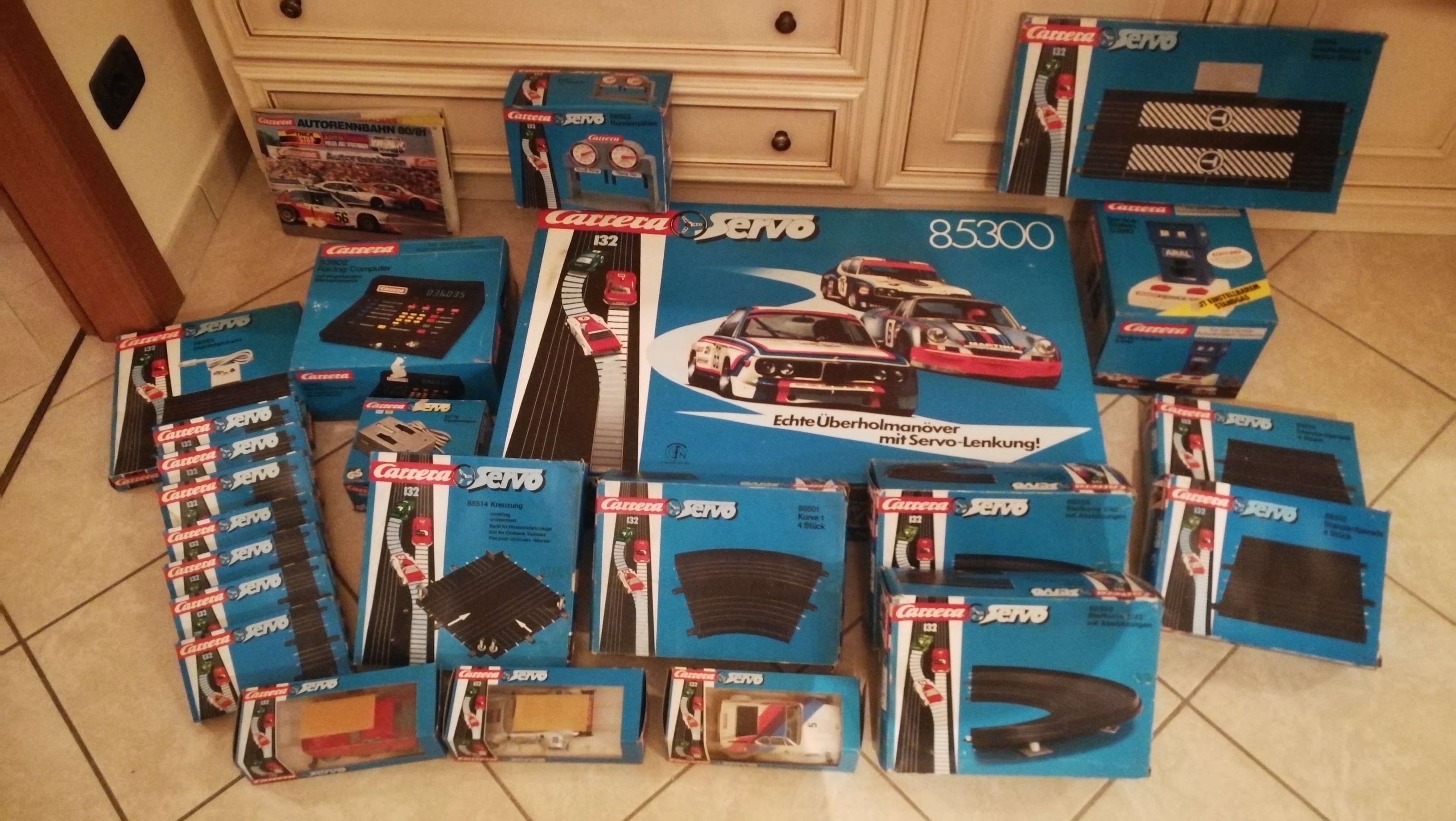 Da ich umziehe, habe ich mich entschlossen, mich von meiner alten Carrera Servo 132 zu trennen. Die Anlage steht seit Jahrzehnten erst im Keller, dann in der Garage. Ich habe sie jetzt rausgeholt, alles entstaubt und die Fahrzeuge getestet: Es funktioniert noch alles. Klar, die Autos brauchen eine gruendliche Reinigung, frisches Oel und neue Reifen, der Gummi ist hart geworden... Am liebsten wuerde ich alles zusammen abgeben. Ich liste euch die einzelnen Teile hier mal auf. Die Anlage steht in der Toskana, also wenn jemand Lust haette, hierher in Urlaub zu kommen