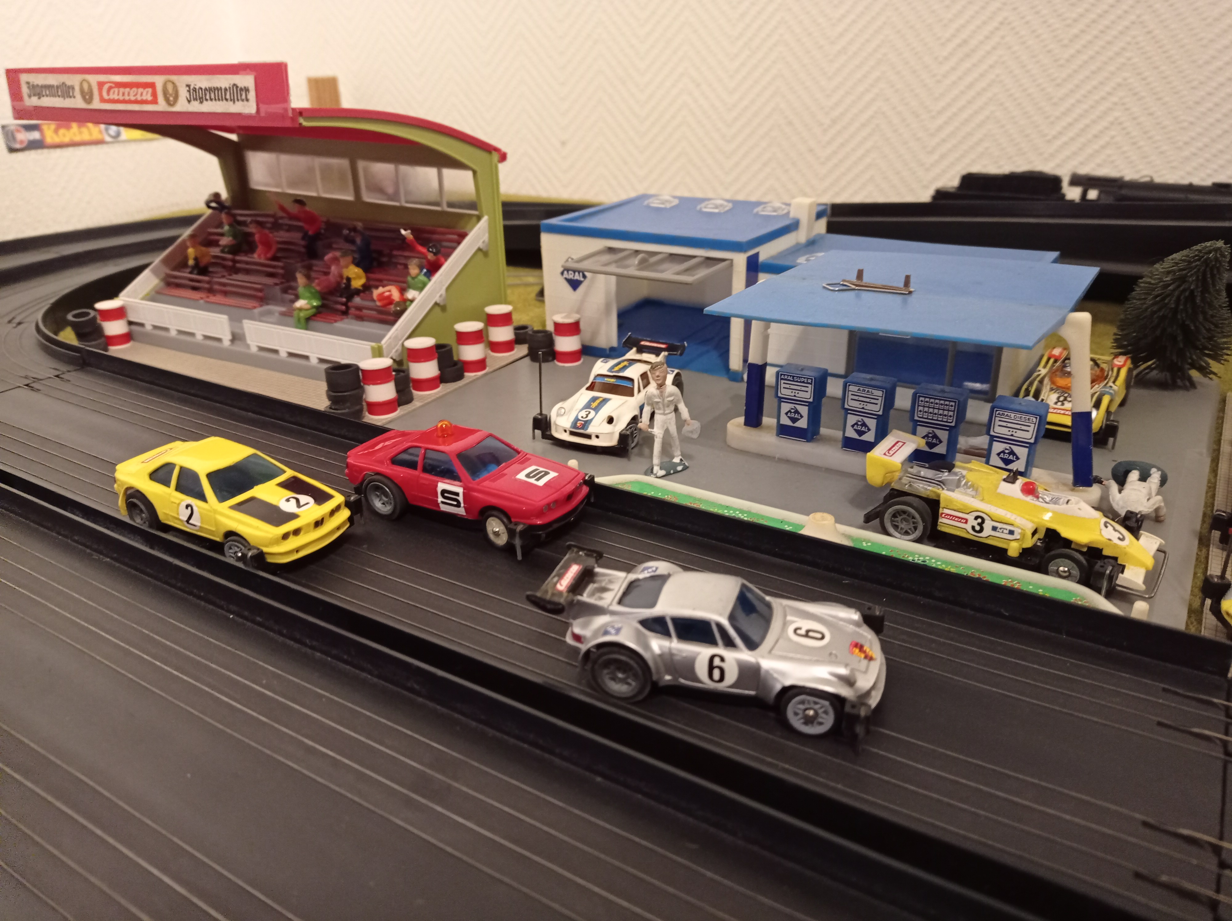 die Tankstelle ist älter als die Servo, die hatte ich vorher schon. Sie wurde damals reaktiviert, weil sie von der Größe passte. Ich glaube das war mal in den Siebzigern ein Werbegeschenk von Aral. Ich konnte sie mit der OVP durch die Zeiten retten. @oerk: ja, so ganz masstabsgetreu ist das nicht, aber was solls. Bei den größeren Carrerabahnen paßt die (Eisen-) Bahn halt nie mit auf die Platte. Ich habe mir in den letzten Jahren den Kindertraum erfüllt: alle Bahnen aus dem 1979/80er Katalog einmal gekauft und ich baue die im Wechsel immer wieder mal auf. Mal sehen, was als nächstes kommt.