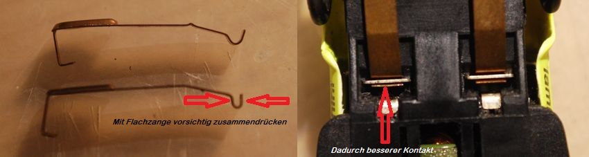 Die Schleifer mit einer Flachzange im Bereich der Halterungen am Fahrzeug vorsichtig zusammendrücken. Dadurch wird der Kontakt zur Halterung besser / der Schleifer liegt besser an. Hat den gleichen Effekt wie die Federdehnung, nur ohne die „Nebenwirkung“ auf die Lenkung.