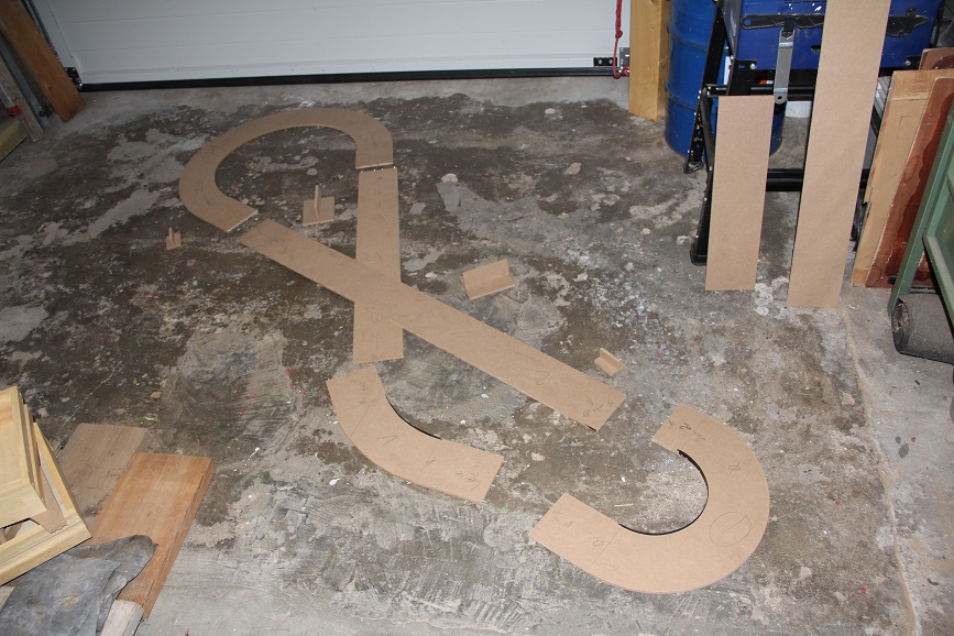 Die Kurven also gefräst, mit einem Fräszirkel auch der Marke Eigenbau, die Geraden wurden auf der Tischkreissäge geschnitten und Kleinigkeiten mit der Stichsäge. Das ganze besteht aus fünf teilen, damit ich den Kram auch mit dem Urlaubsgepäck zurück nach Hamburg bekam und es sich so auch leichter schneiden ließ. Eine Sache auf die ich geachtet habe, ist dass ich keine Schnittstellen in oder am Ende von Kurven habe, sondern nur auf den geraden, das macht es leichter mit der Leitplanke. Hier die Fertigen Teile.
