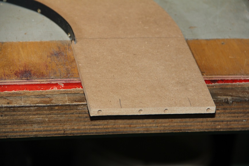 Wie bekommt man den Kram nun zusammen. Zum einen mit der Leitplanke, aber das reichte mir nicht, also habe ich vom Original abgeschaut und an die Stellen wo sonst die Zapfen sitzen 3,5mm Löcher gebohrt und M4 Gewindestangen-Stücke rein gedreht, mit 4mm Löchern auf dem Gegenstück gibt das eine ganz gute Verbindung. Allerdings vermute ich das es mit der Zeit bei öfteren auseinandernehmen zum Ausreißen des MDF führen wird. Also eher für den Festaufbau. Zum Bohren, damit die Löcher übereinstimmen, hab ich mir eine Bohrschablone gebaut, auch um sicherzugehen, dass die Löcher mittig sitzen.