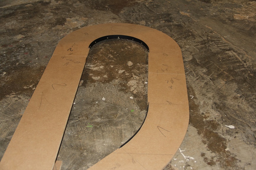 Die Kurven also gefräst, mit einem Fräszirkel auch der Marke Eigenbau, die Geraden wurden auf der Tischkreissäge geschnitten und Kleinigkeiten mit der Stichsäge. Das ganze besteht aus fünf teilen, damit ich den Kram auch mit dem Urlaubsgepäck zurück nach Hamburg bekam und es sich so auch leichter schneiden ließ. Eine Sache auf die ich geachtet habe, ist dass ich keine Schnittstellen in oder am Ende von Kurven habe, sondern nur auf den geraden, das macht es leichter mit der Leitplanke. Hier die Fertigen Teile.