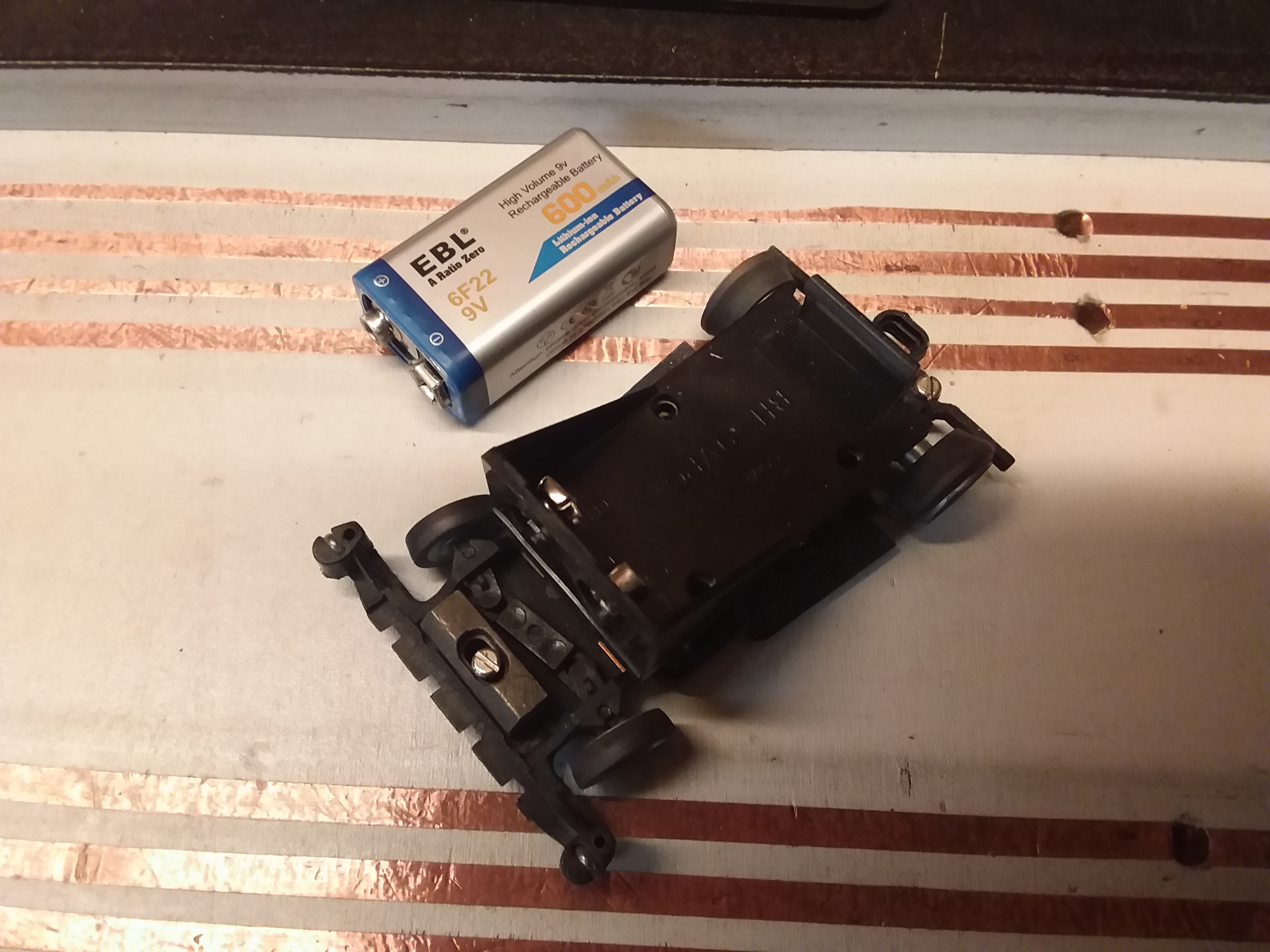 Einfacher gehts nicht: Ein Hindi-Chassis mit Batteriehalter draufgeklebt, nicht mal ein Schalter. Nur um die Idee mal zu testen. Bekommt noch eine Karosserie.