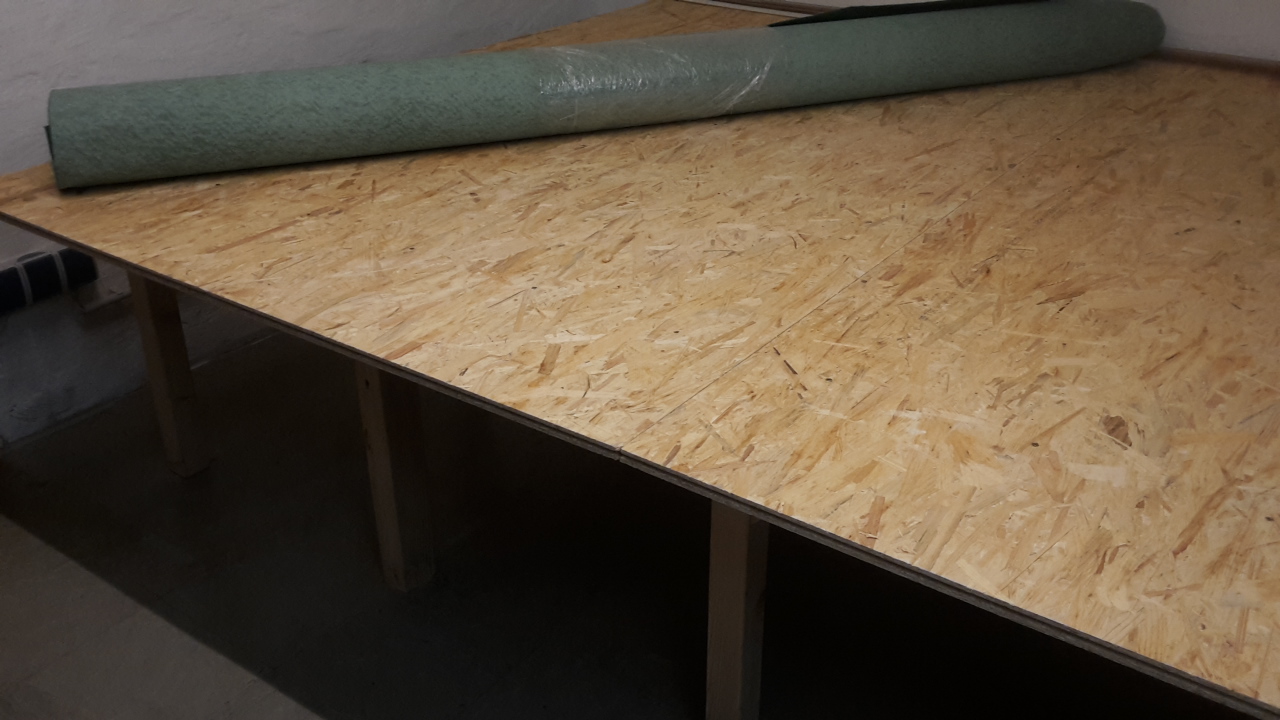 Den Teppich habe ich nur an den Stößen mit doppelseitigem Klebeband auf der Platte fixiert, sonst liegt er einfach nur druff.