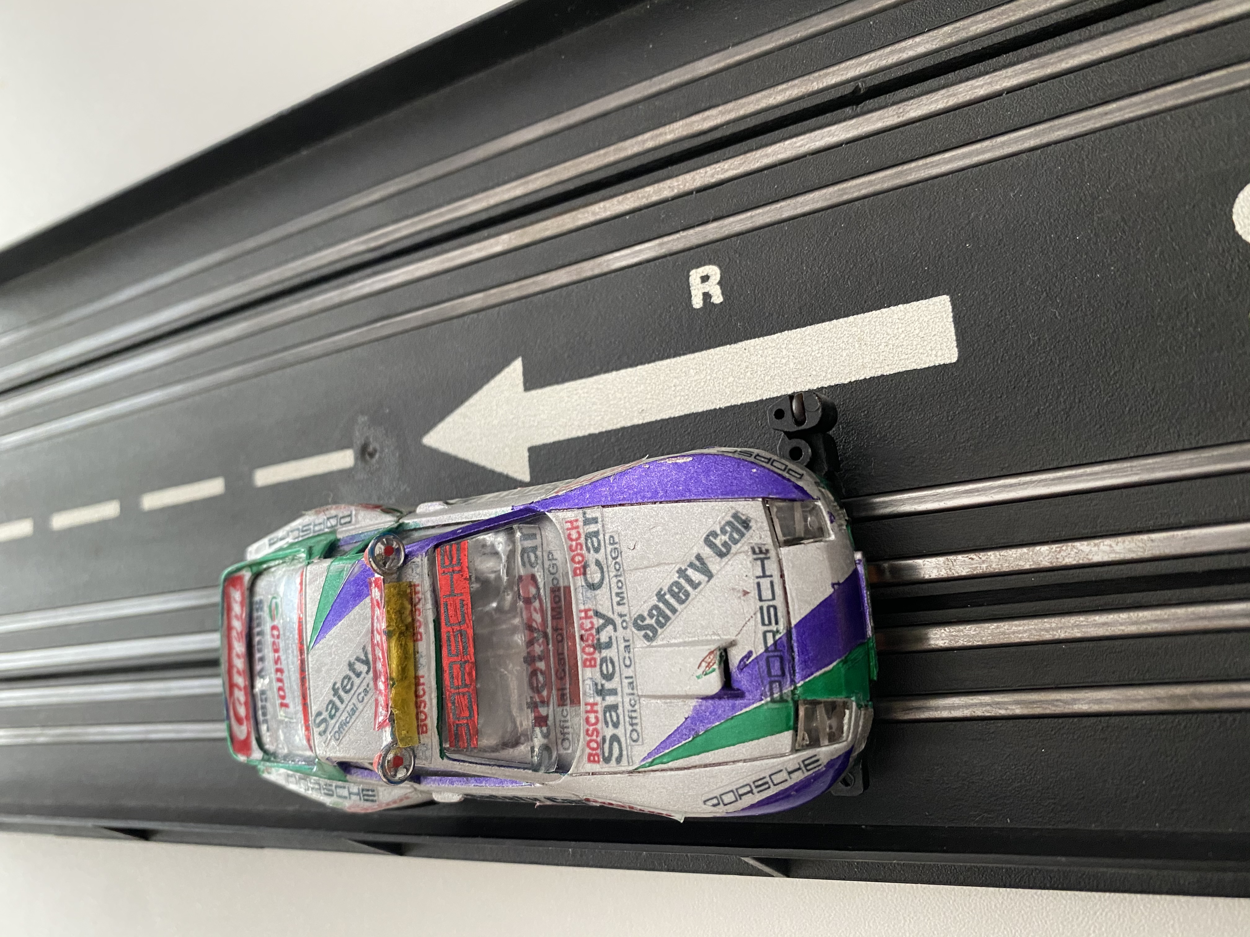 Hey zusammen, war etwas still um mich , lag aber im Krankenhaus weil ich 3 Leistenbrüche beseitigen lies. Zurück zum Thema, mein Jägermeister Porsche Chasis war an den Schraubstellen abgebrochen, 😢, ersetzt durch ein Safety Car Chasis günstig für n 5er bei EBay Kleinanzeigen und sorgt nun für Sicherheit auf der Rennbahn 😬