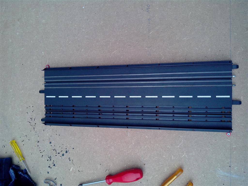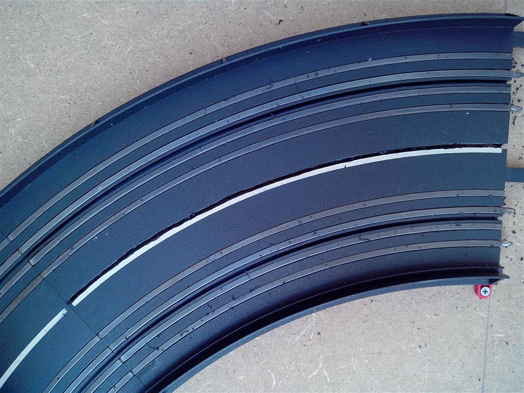 Danke, ist auch easy. Beim einstellen des Radius sollte man sich schon Zeit nehmen. Beim Fräsen darauf achten das geschmolzenes Material von der Werkzeugspitze sofort entfernt wird. Die Diamantfräse die ich genommen habe, hat einen Durchmesser von 1,5mm, beim Norma im Set für unter fünf Euro. Am Anfang sind mir leider die zwei feinsten beim abziehen des geschmolzenen Plastiks die Spitzen abgebrochen. Naja, bei dem Preis nicht schlimm. Beim Fräsen fahre ich über die Fahrbahn immer hin und her, und arbeite mich so auf ganzer Länge durchs Material. Dadurch wird der Druck auf der Fräse nicht so hoch. Mit der Geschwindigkeit liege ich auch nicht so hoch. Sobald die Fahrbahn durchbrochen ist, rumdrehen und mit dem Seitenschneider die Stege durch knipsen. Geht schneller als fräsen und schont den Fräser.