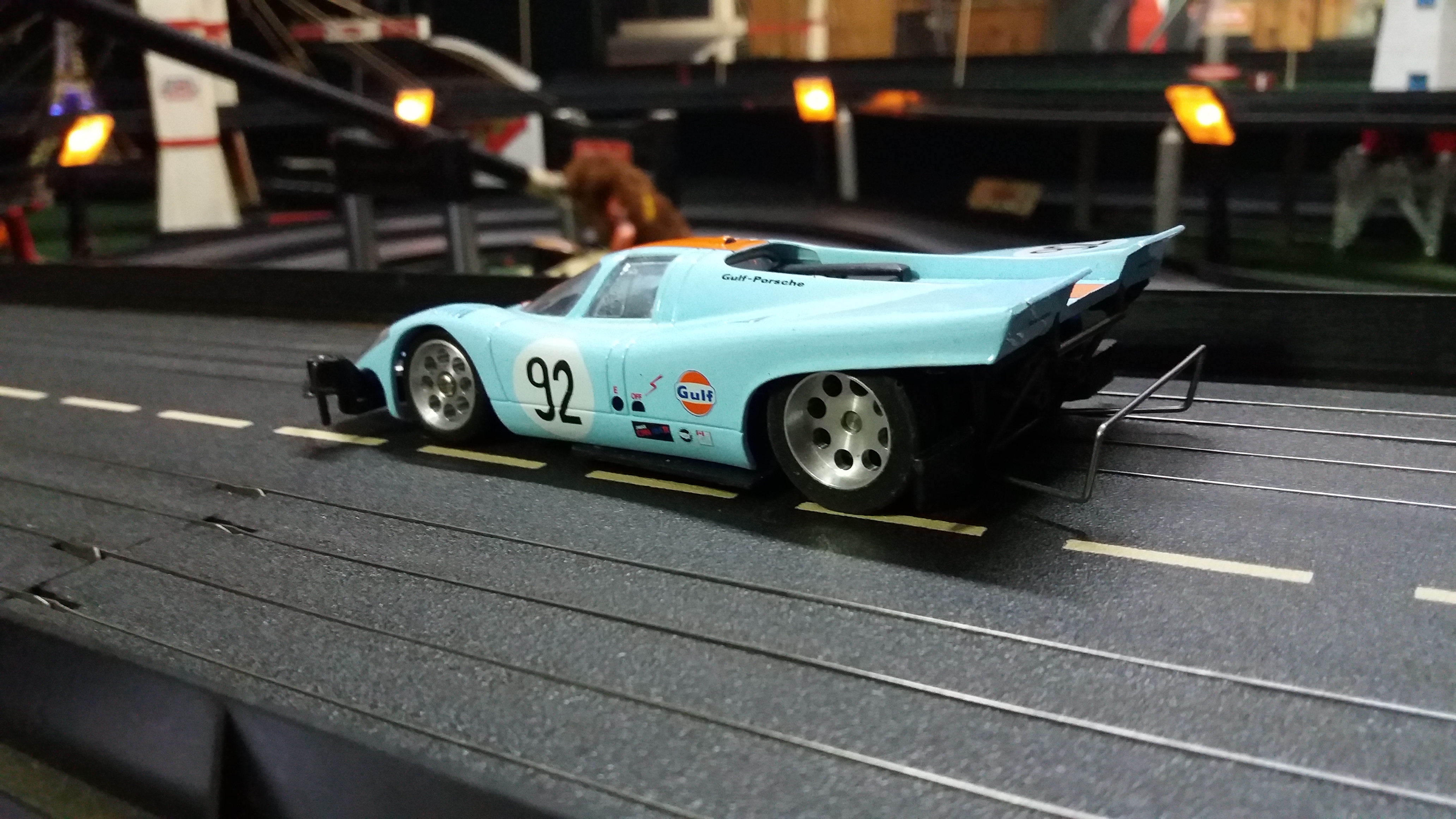 So eine weiß grüne PorscheMinna liegt auch noch irgendwo rum. Bei dem ist die Karosse zerstört. Da nehm ich das blaulichtkapperl und bastel das auf den Hindi.