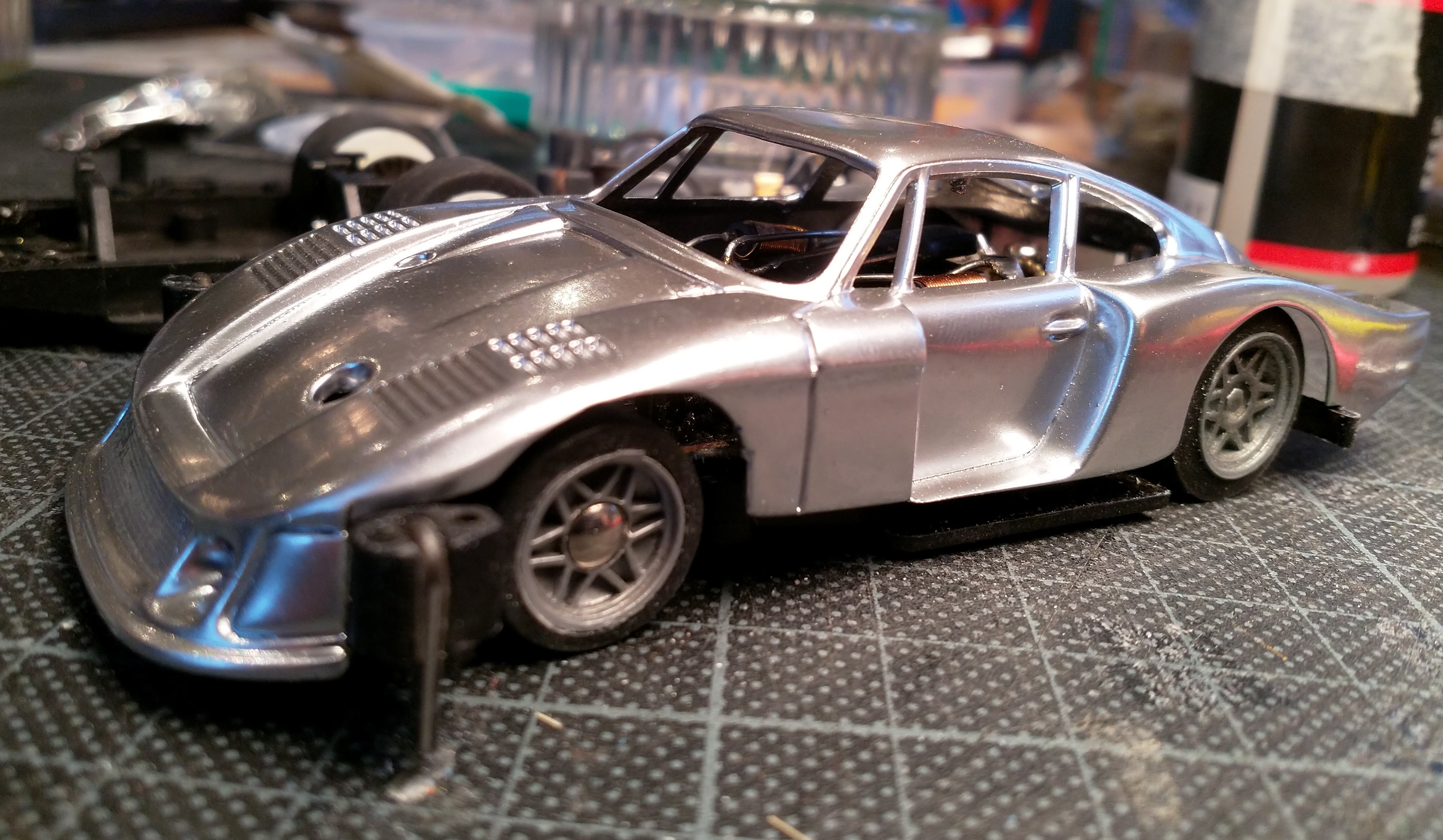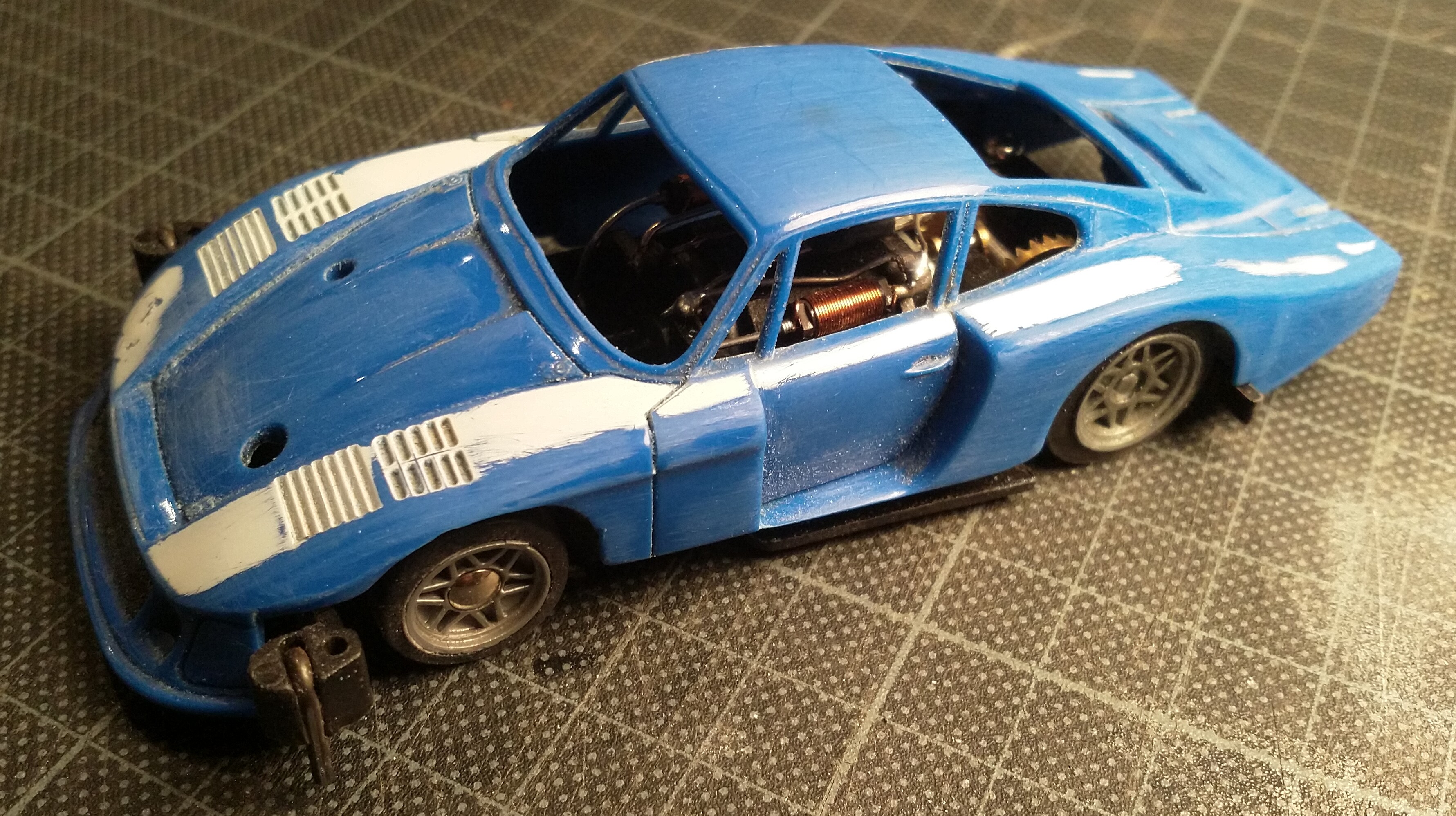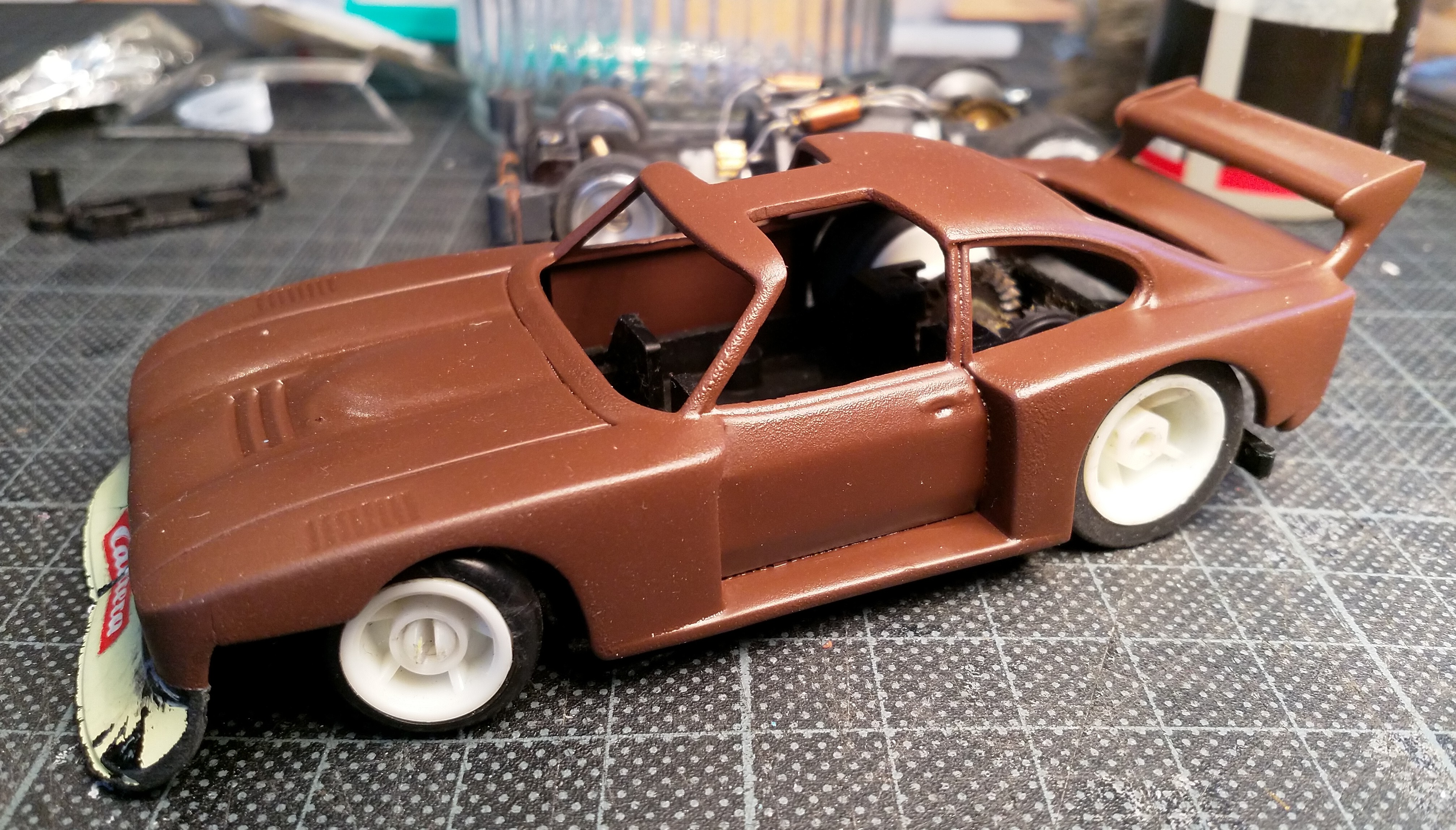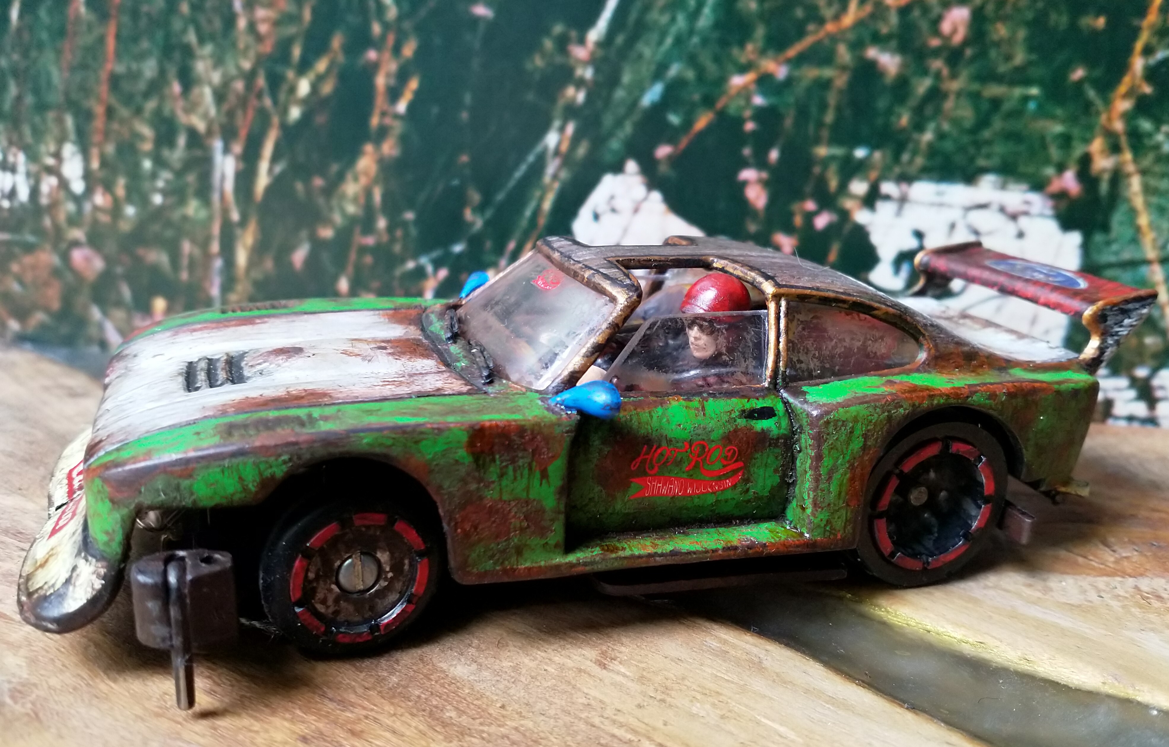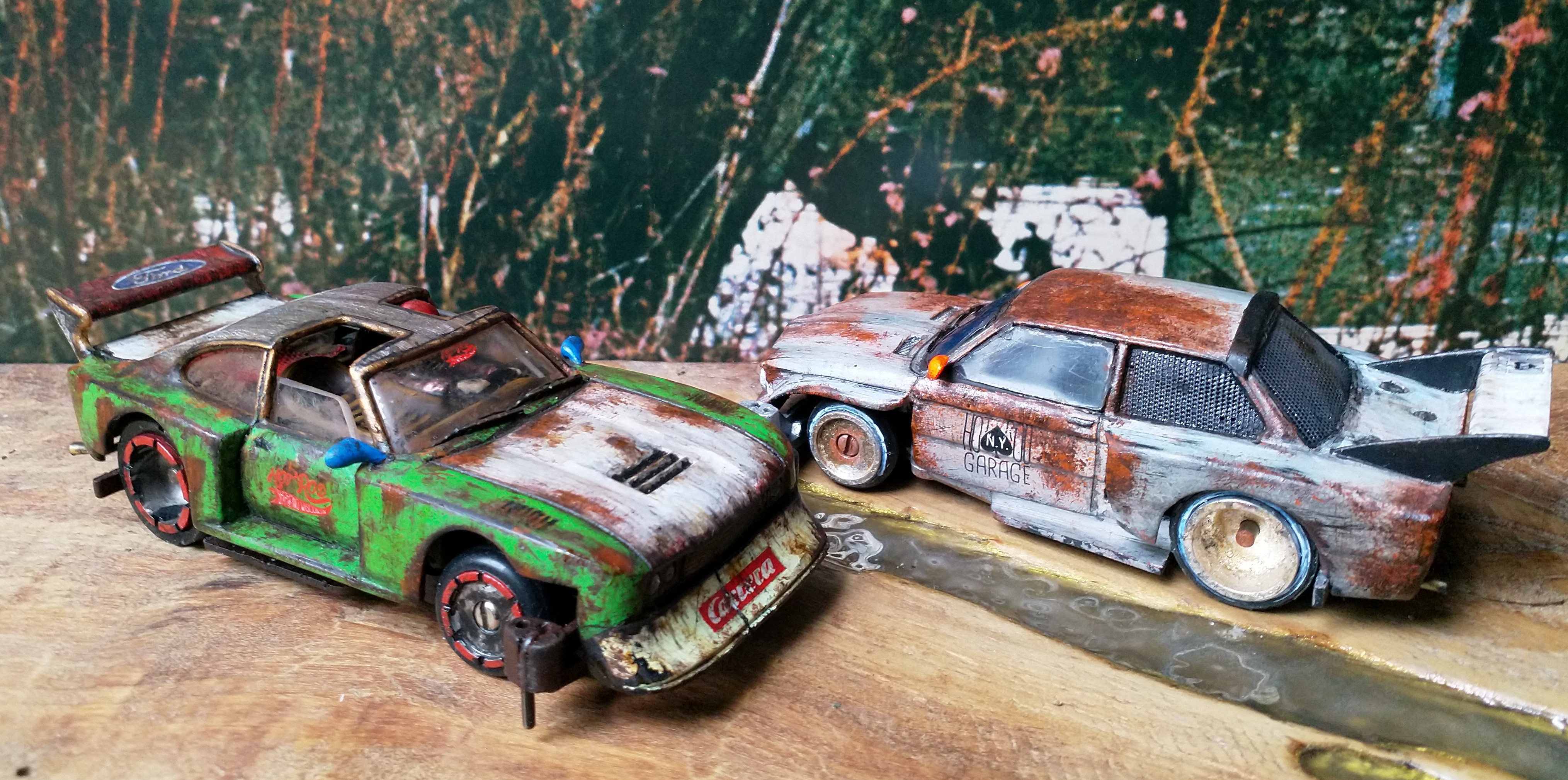 Gerissene Frontspoiler repariere ich immer mit Fliegengitter und Sekundenkleber damit die Karosse nicht komplett durchreißt. Habe hier zum ersten Mal die Salztechnik ausprobiert. Erst komplett Rosteffekt draufgemacht und dann teilweise mit Wasser-Salz-Gemisch abgedeckt und überlackiert.