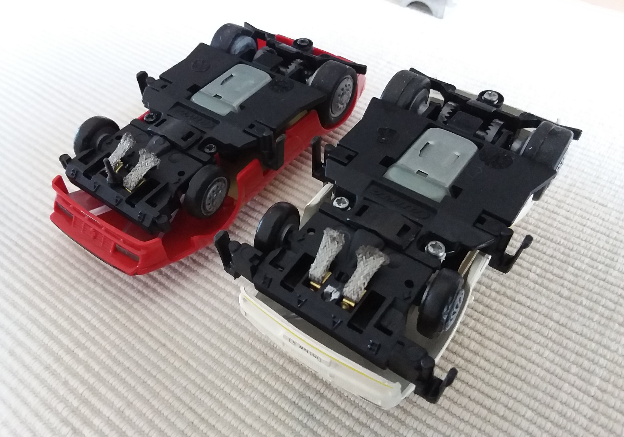 Das Kontaktsystem ist nicht original, es handelt sich um zweigeteilte Carrera-Go-Zöpfe, aber es funktioniert gut, die Autos fahren einwandfrei.