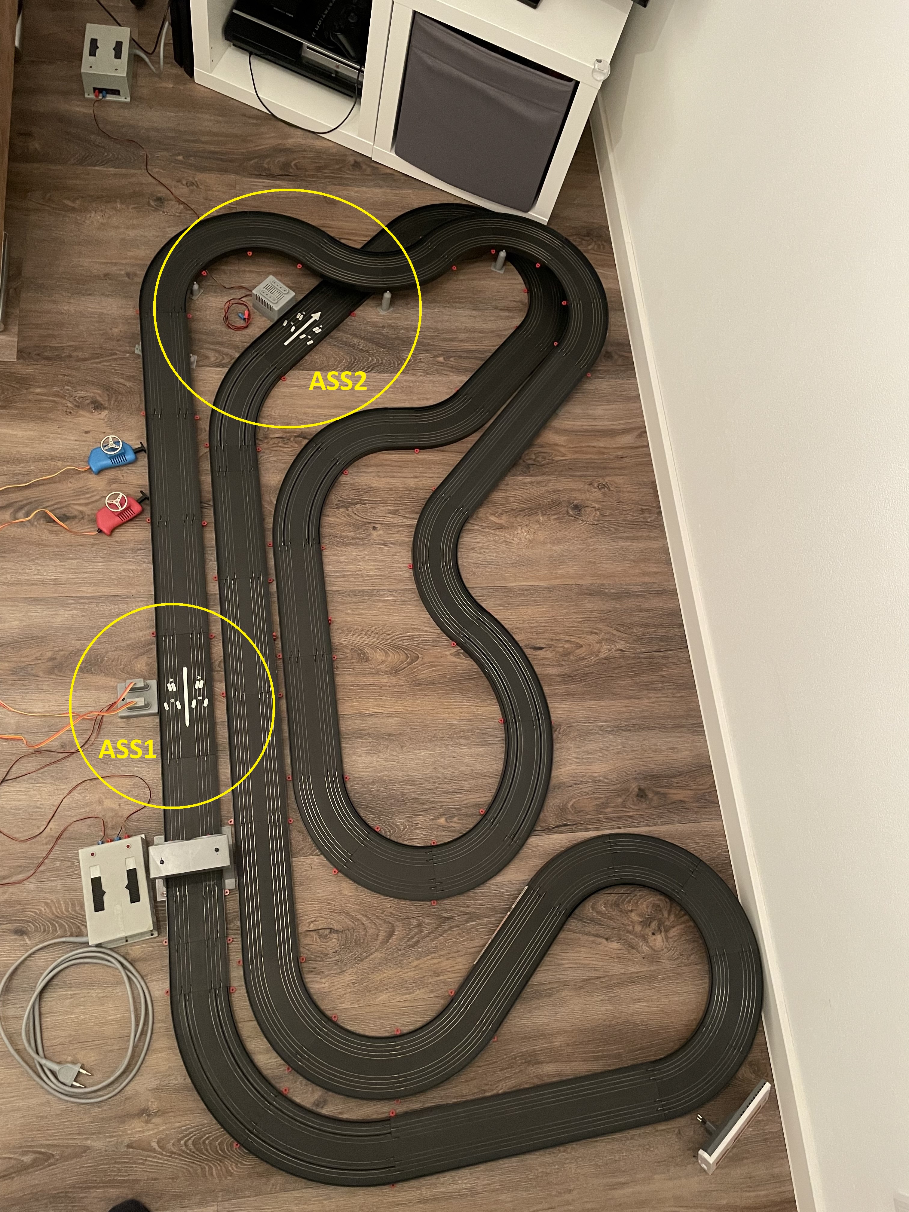 - ASS1 mit zwei Reglern und eigenem Trafo für das Steuern der Rennfahrzeuge.