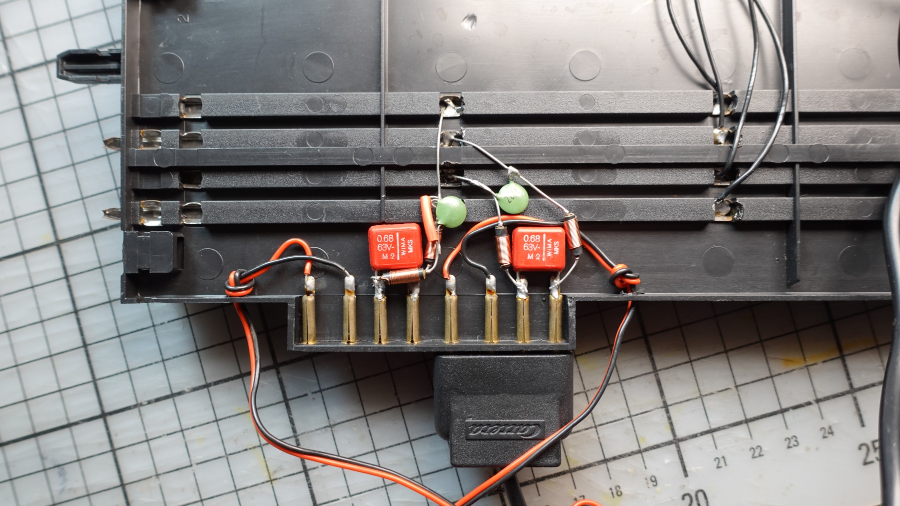 Nebenbei sei bemerkt, dass es die totale Fehlkonstruktion ist, weil die seitlich eingesteckten Regler-Anschlüsse dicker sind und die Schiene damit vom Boden abheben...