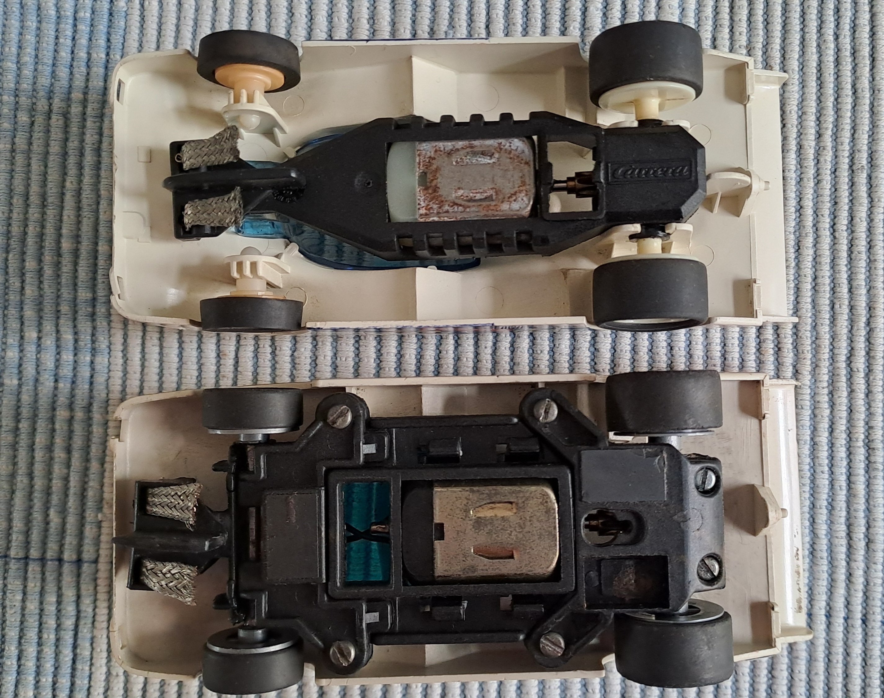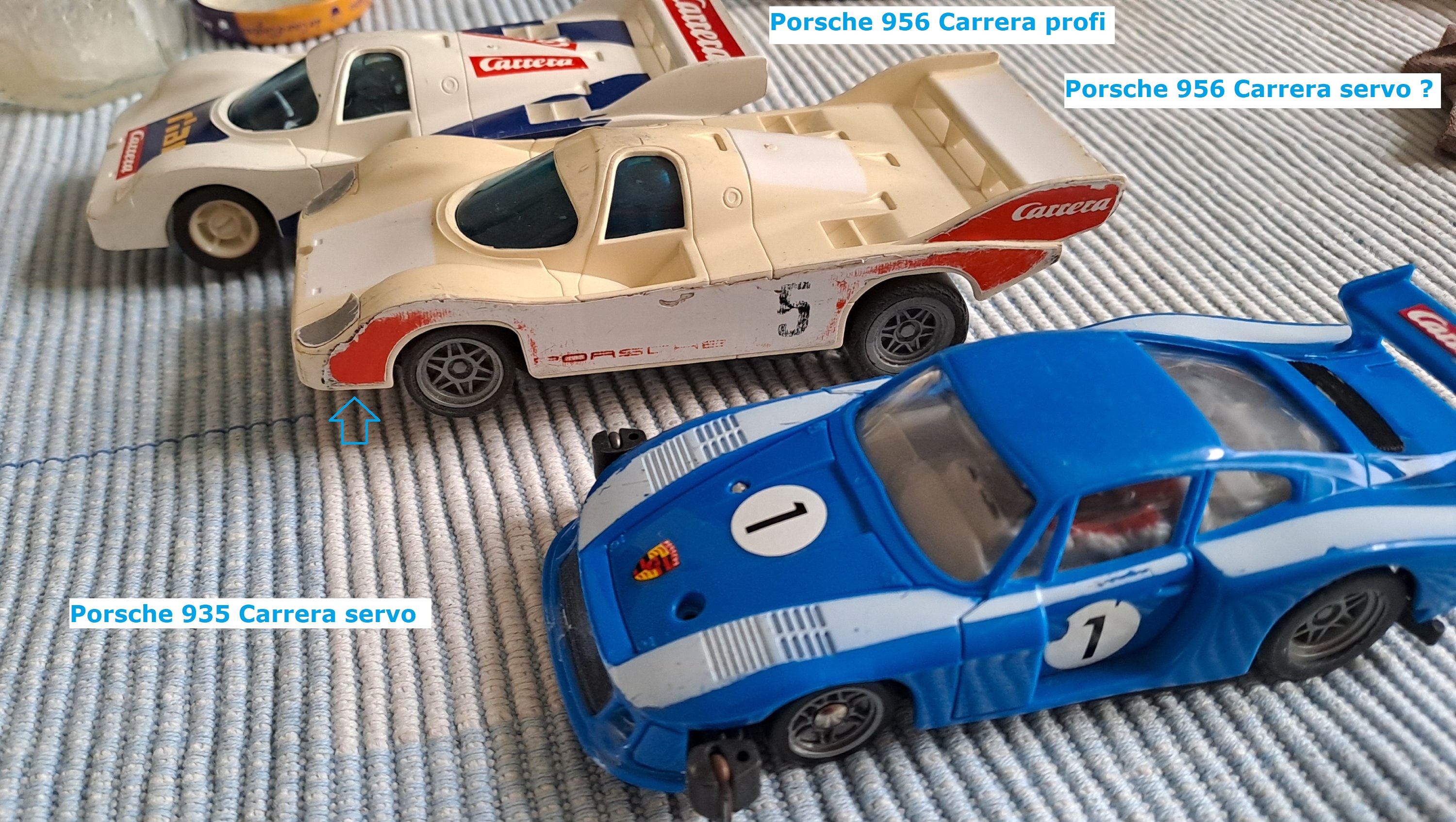 1/ Von oben gesehen ist er äußerlich bis auf die Felgen identisch mit dem Carrera Profi. Wenn die Karosserie ursprünglich für Servos gedacht war, wäre an der Vorderseite eine Aussparung vorhanden, um das Führungshorn zu platzieren (siehe blauer Pfeil).