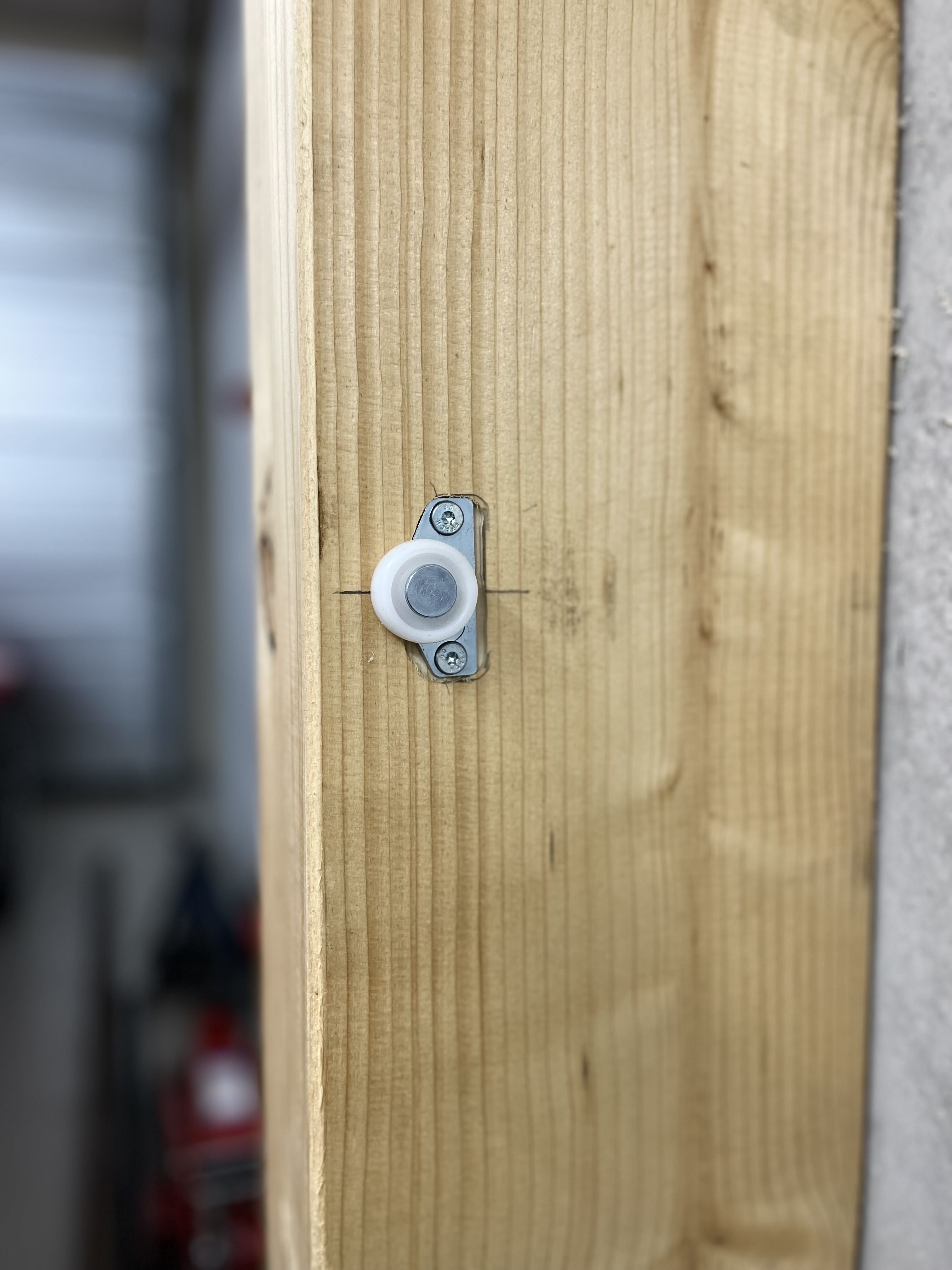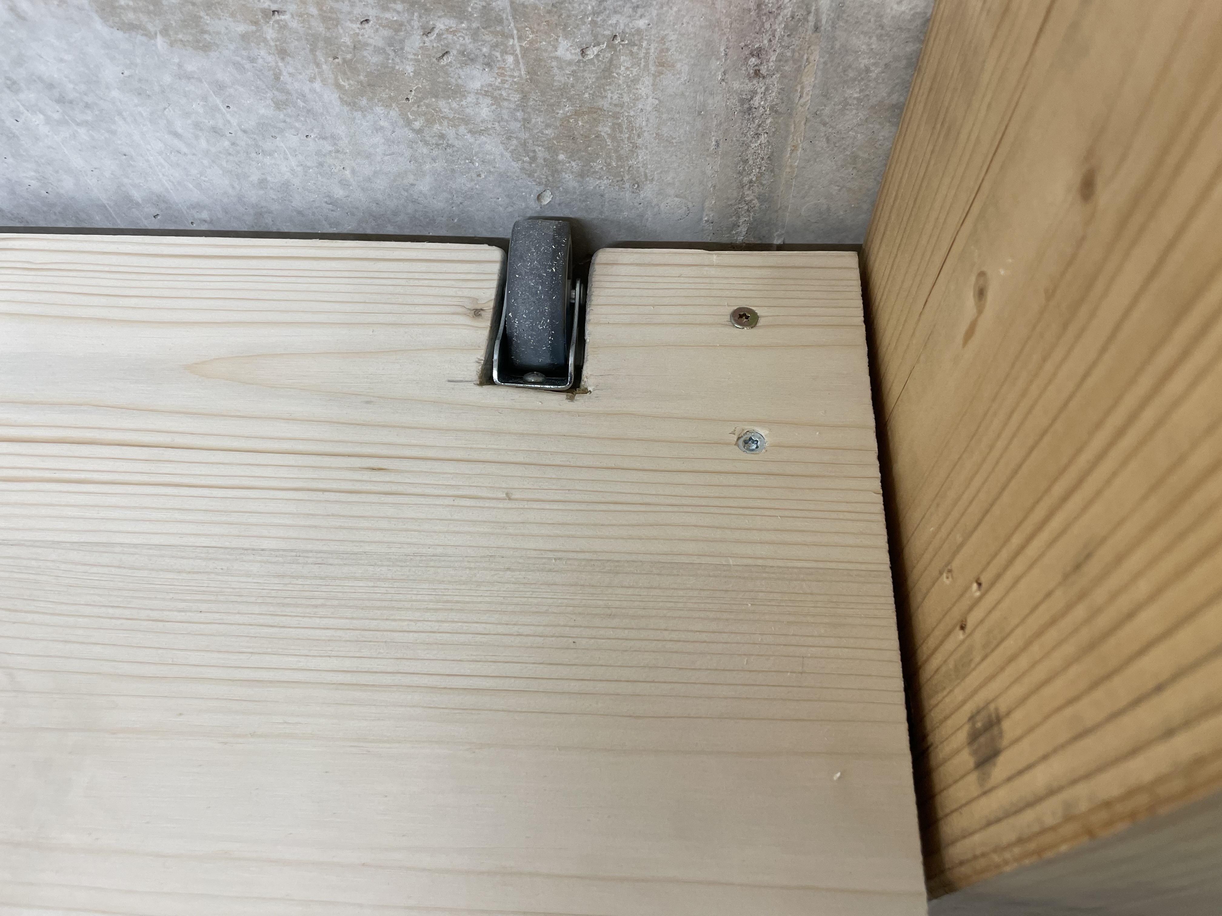 Als Erstes waren mir die 1,99€ Baumarktrollen, auf der die Platte lasten soll, ein wenig zu schwach ausgelegt. Die Platte mit Gestell schätze ich auf ca. 100KG…also, lange Schrauben besorgt, vorne abgedreht und zwei Kugellager montiert…hält!