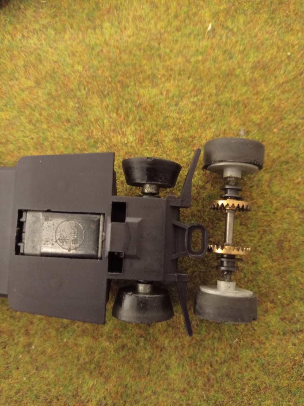 Auseinanderbauen, Reinigen, Testfahren - hat geklappt, aber nach dem Wiederaufsetzen der Karosserie lief wieder nichts mehr. Lag also nicht am Teppichboden, sondern daran, daß die Achse zu breit ist und an der Karo schleift: ist eine Achse mit zwei Plastikfelgen, im Gegensatz zu den Metallfelgen, die ich sonst so von V1 kenne.