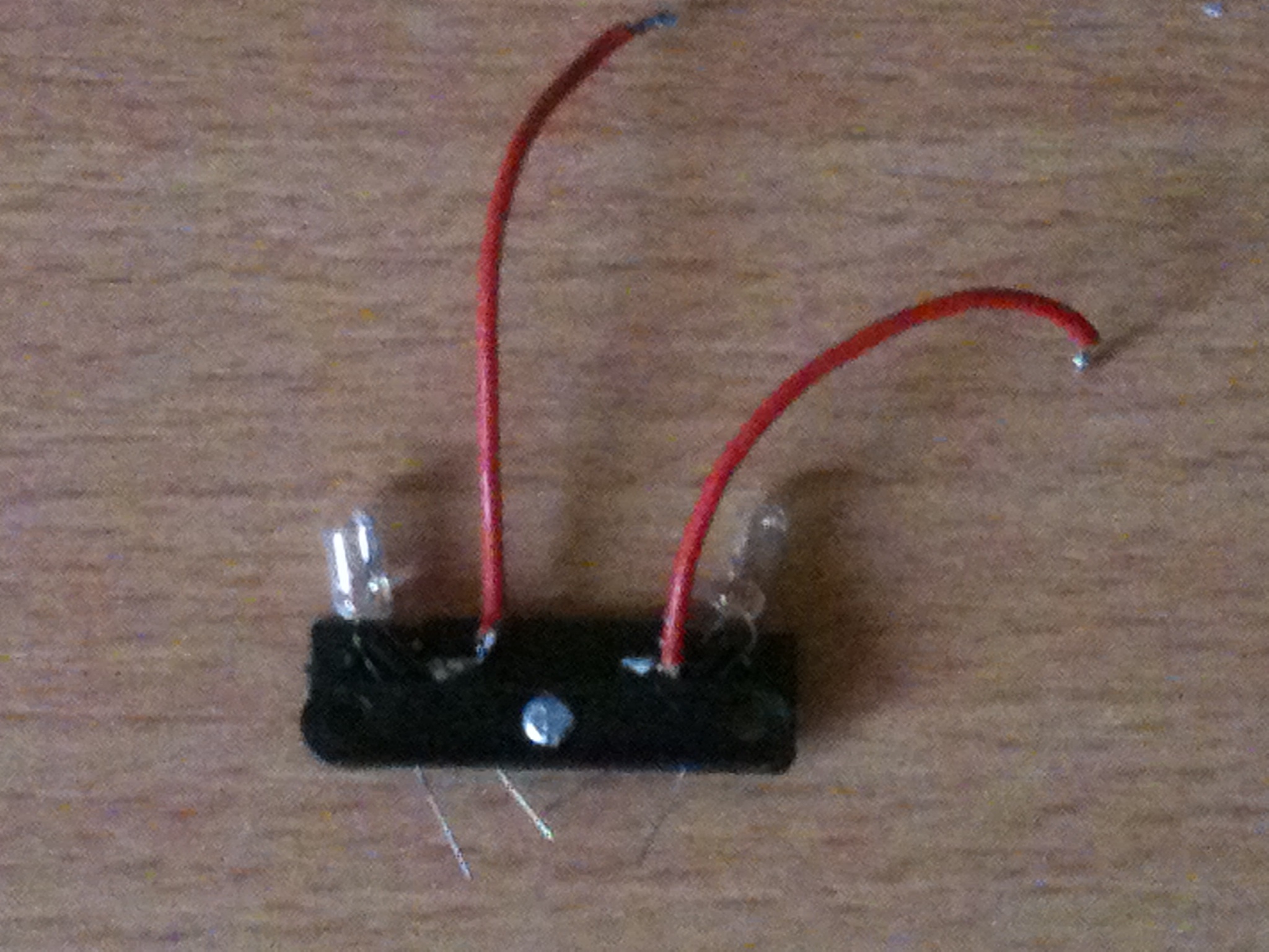 Die originale Beleuchtung aller V1 Fahrzeuge wurde mit der im Bild erkennbaren Plastik Brücke aufgebaut. Die Schraube in der Mitte hält Ober- und Unterteil mit dem Isolator dazwischen zusammen. Die beiden leeren Schraublöcher dienen zur Befestigung an der Karosserie. Links und rechts können dann die beiden Glühlämpchen je einmal ober- und einmal unterhalb des Isolators eingeklemmt werden. Stromzufuhr dann mittels der beiden Kabel, die direkt an die Lötfahnen angelötet werden. Die Lämpchen werden dann in die Klarglas-Einsätze für die Scheinwerfer gesteckt, so dass die Straße ausgeleuchtet wird.