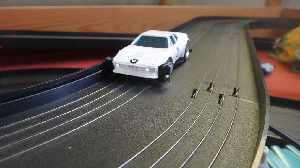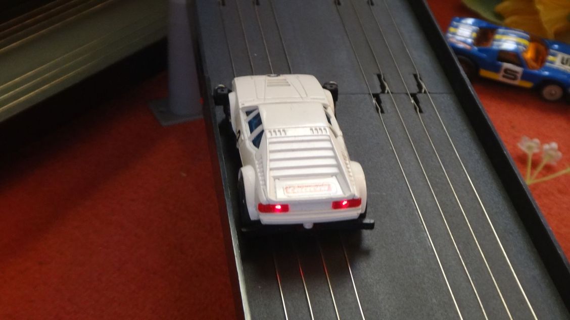 Nur das Bremslicht schaltet nicht sauber am Originalen Carrera Trafo (verzögert)...da ich auf den riesigen Kondensator verzichtet habe...Trotzdem sehr schön...Das Bürsten/Kohlenfeuer am Kollektor (Motor) is der Auslöser