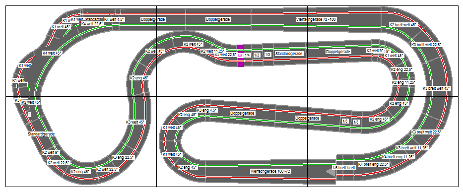 Die Außenbahn ist eher klassisch: Innenfürhung etwas schneller und geradliniger (ähnlich der ganz inneren Kurve von Verlauf her), die Außenbahn normal befahrbar aber mit kleinen Unwegsamkeiten, die den Full-Speed-Vorteil etwas relativieren - das ist ja inzwischen schon so in deinem Entwurf drin.