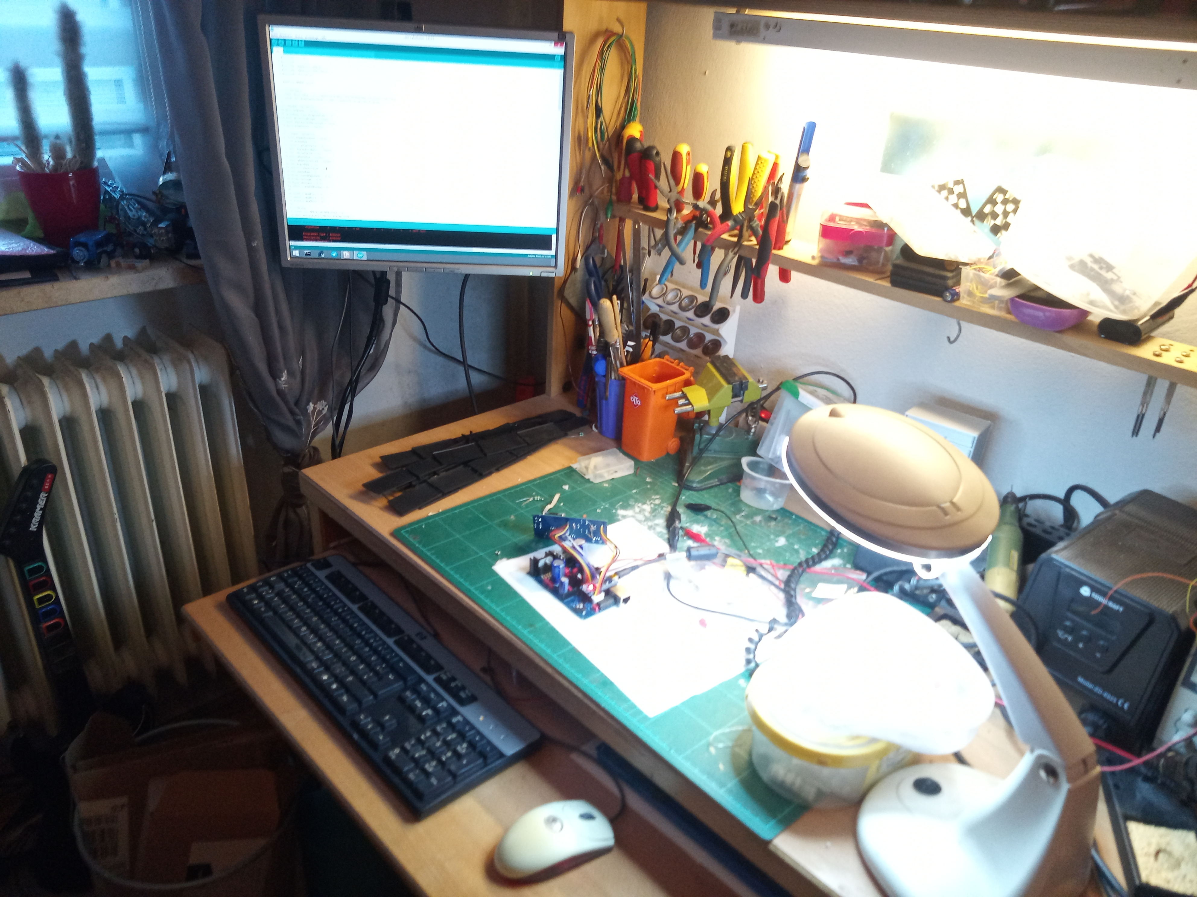 Der Arbeitsplatz ist echt gut, ich habe Platz und kann trotzdem an Ort und Stelle programmieren. Sogar der bisher relativ sinnlose Auszug hat einen Daseinszweck erhalten (war mal für ein 160er-Testo:o-wal: gedacht, das war eine Schnapsidee, dann für eine Modellbahn-Testo:o-wal: , das war auch Käse).