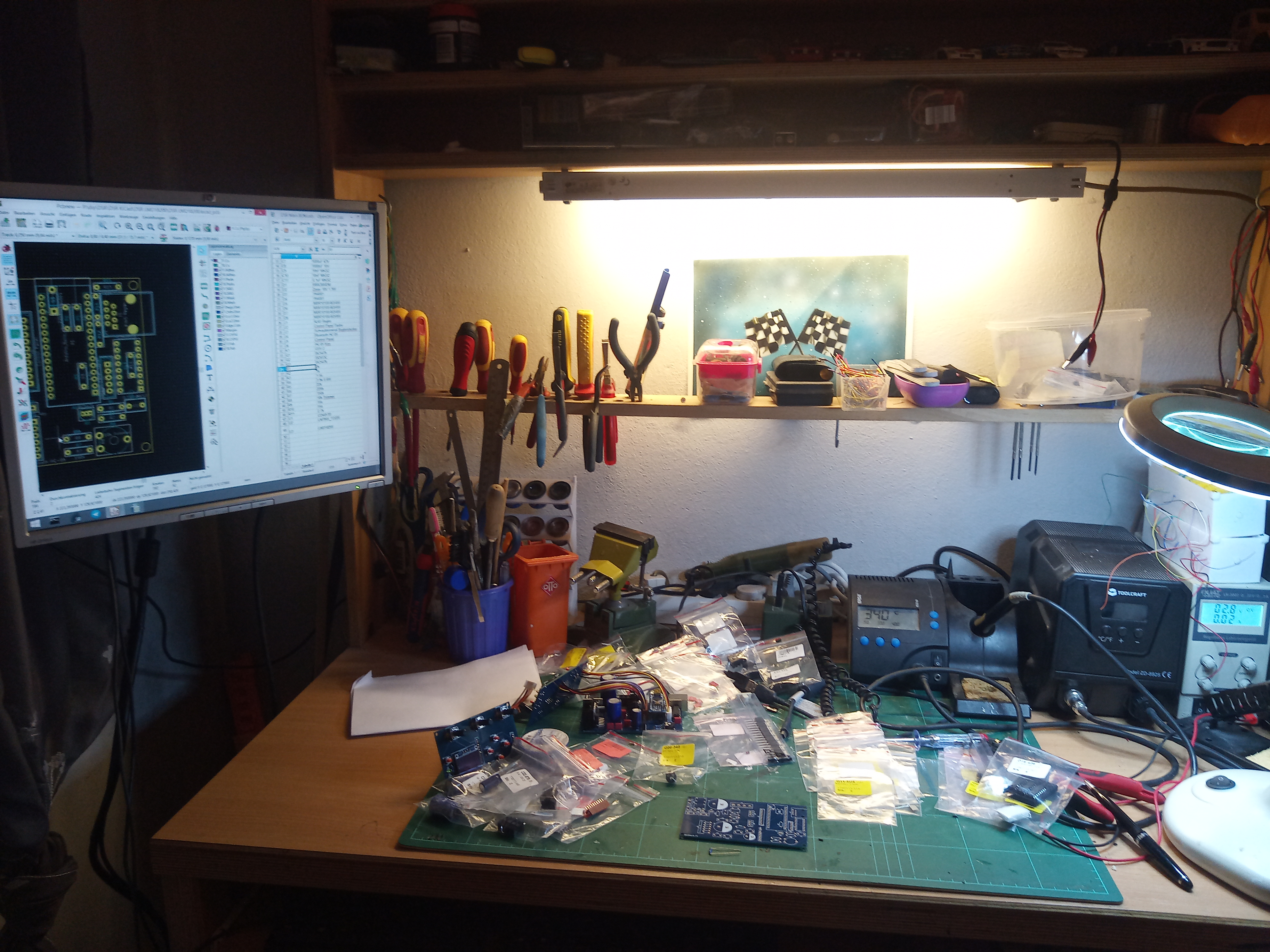 Drittmonitor an die Wand, über langes Kabel mit dem PC verbinden, Maus und Tastatur in den sowieso vorhandenen Auszug. Der Monitor lag sowieso ohne Fuss rum, hat einen USB-Hub eingebaut, Wandhalterung lag auch rum - perfekt! Heute gleich mal zur Entspannung eine Platine gelötet, früher oder später brauche ich ohnehin zwei. Macht richtig Spaß so.