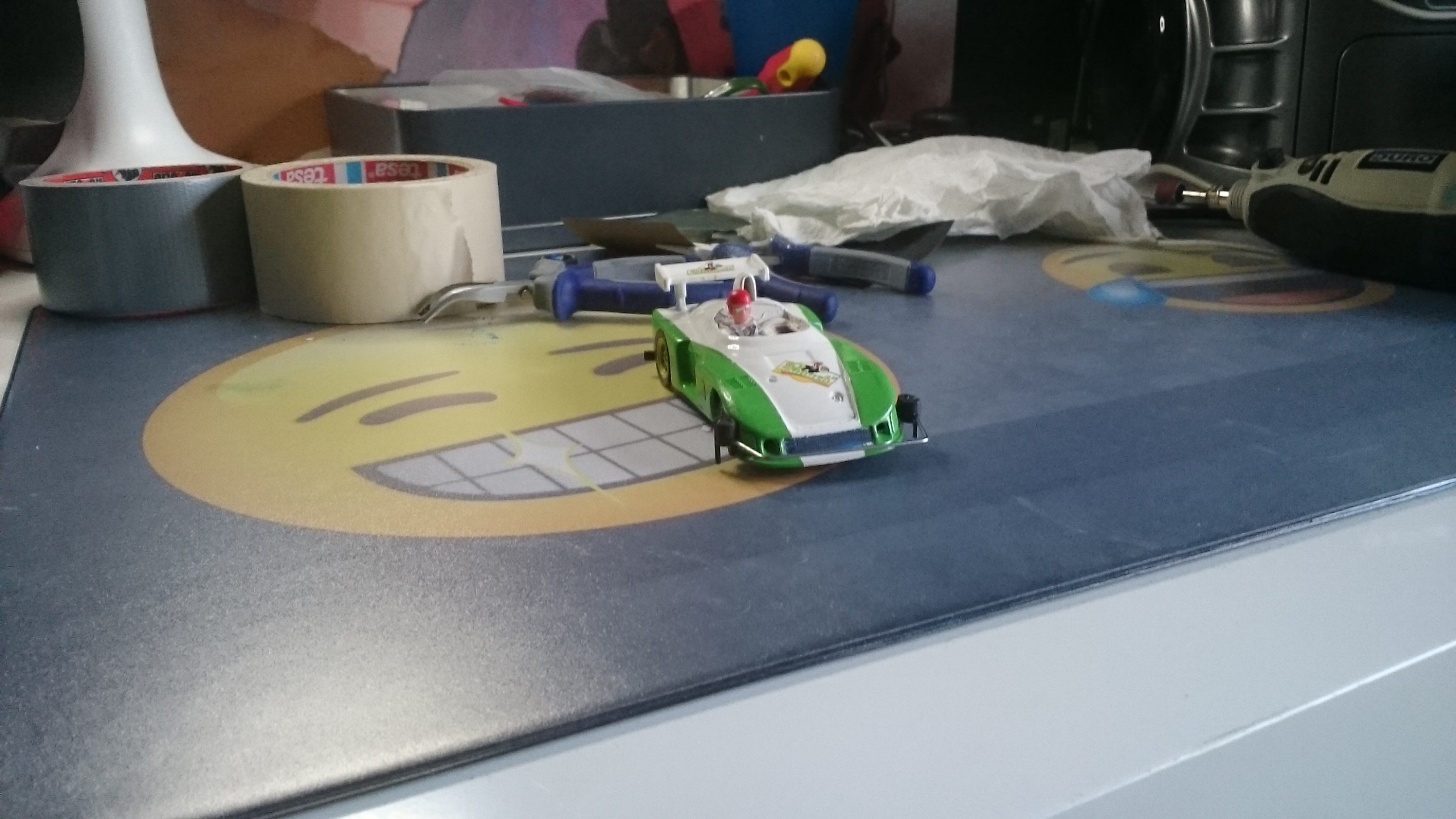 Das Ausgangsmaterial: Entlackt, Kotflügel schmaler, Servo-Achse rein, Magnetkupplung dran, Probefahrt - läuft .... und fliegt in den Innenkurven...