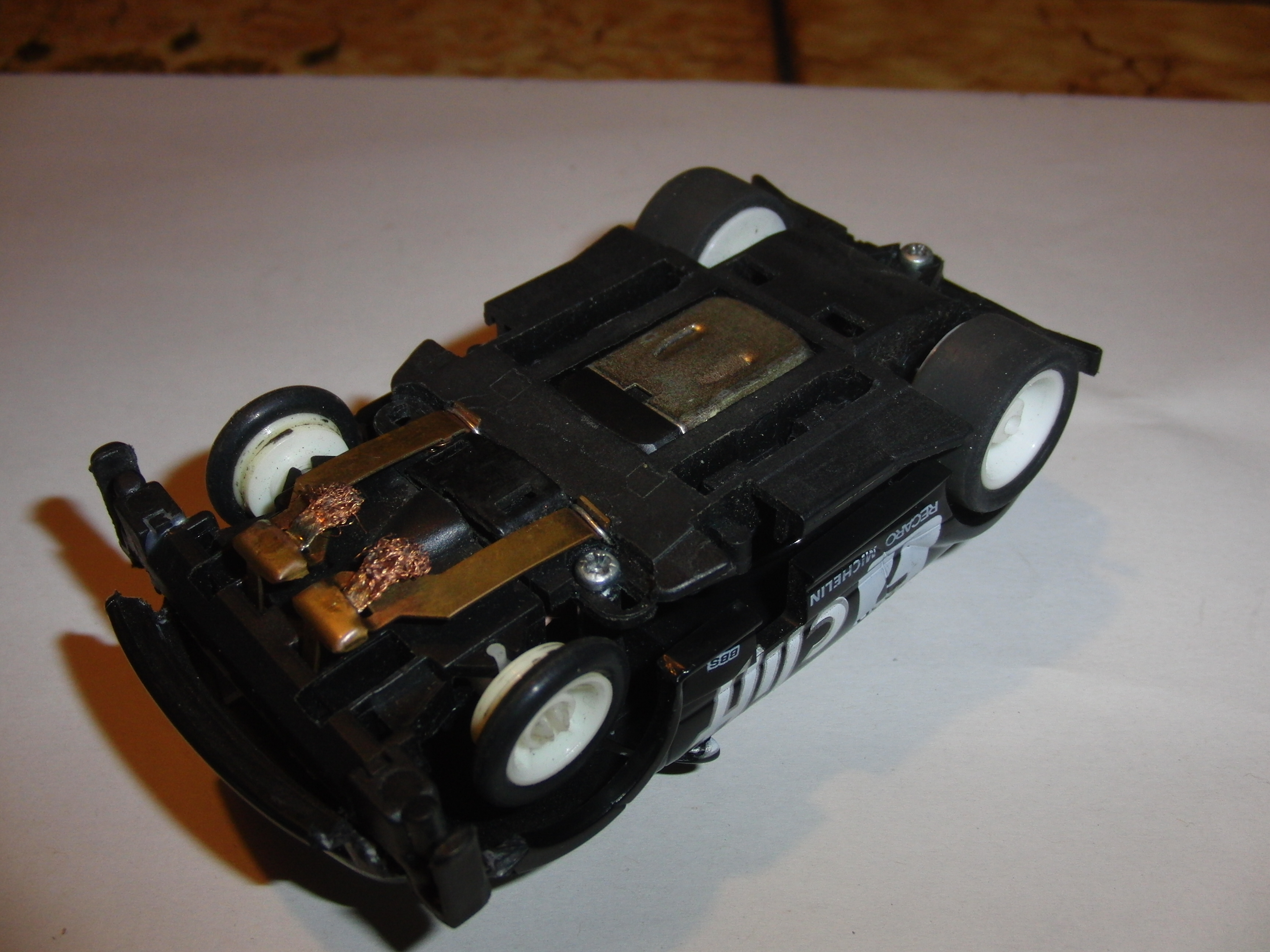 Hier noch was Besonders. Sieht zuerst ganz normal aus. Schaut man aber genau von unten - ein Umbau von V2 auf V1, anstelle der Bürsten die starren Schleifer von den V1 Autos. Hab mal neue Schleifer drauf gemacht( ne ganz schöne Mengerei ) läuft aber richtig gut. Hatte vor 2 Jahren 4 Stück davon gekauft, ohne zu wissen was für eine Rarität kommt. Hab 2 davon vekauft(was ich bedauere). Denke, sowas wird's wohl nicht mehr geben.