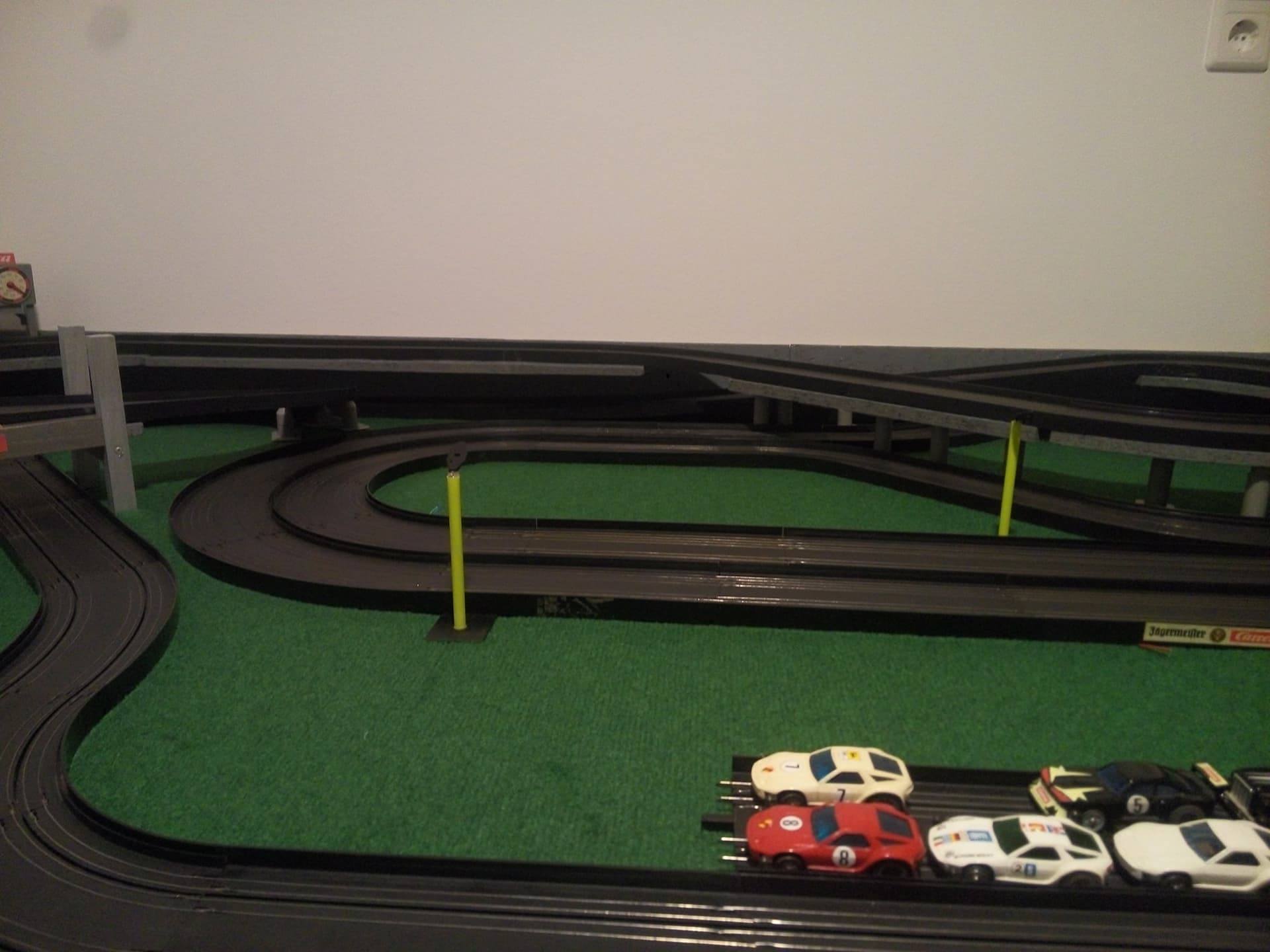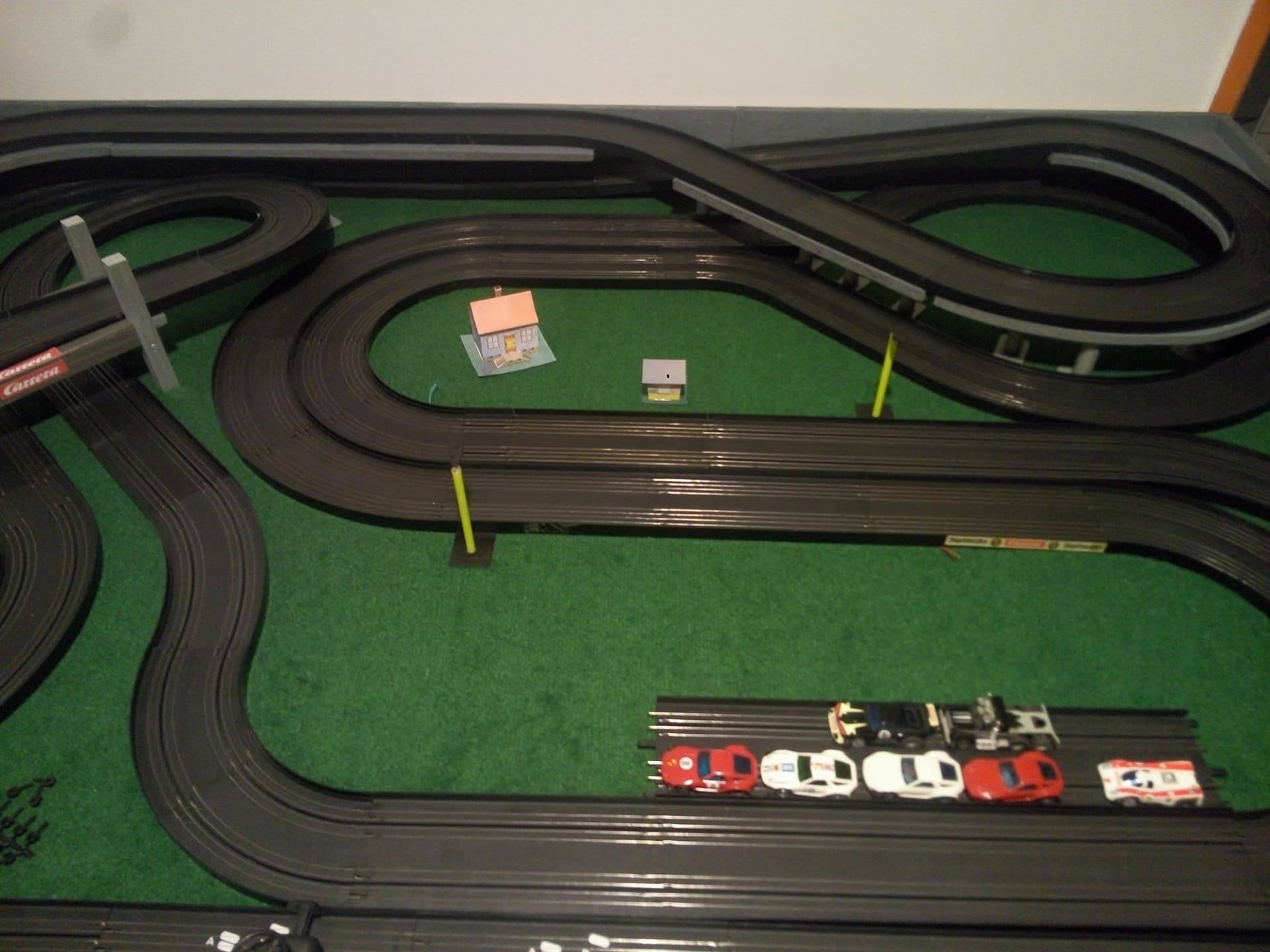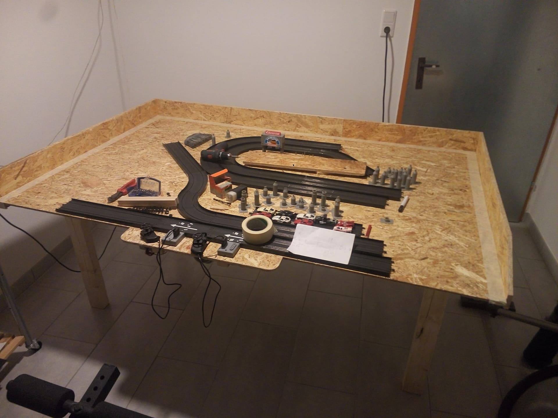Noch ein kleiner Hinweis zur Bande / Begrenzung deiner Platte. Mach die Banden höher (vor allem dort, wo du in der 2. Ebene fährst) und polster sie. Oder mach noch Fangnetze oben drauf. Und vorne rechts würde ich auch noch eine Abflugsicherung hinbauen. Deine Autos werden es dir danken...