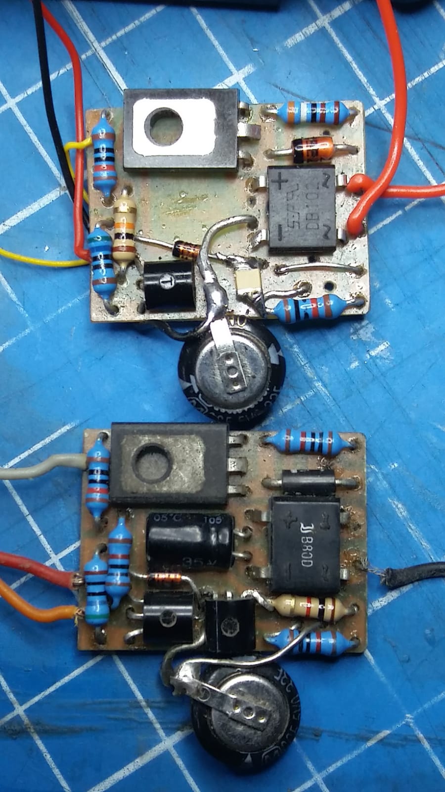 Ein Widerstand (da is jetzt ne Drahtbrücke drin, die kommt auch weg) und der 7806 is weg...der dicke Elko durch einen kleinen Kerko ersetzt.