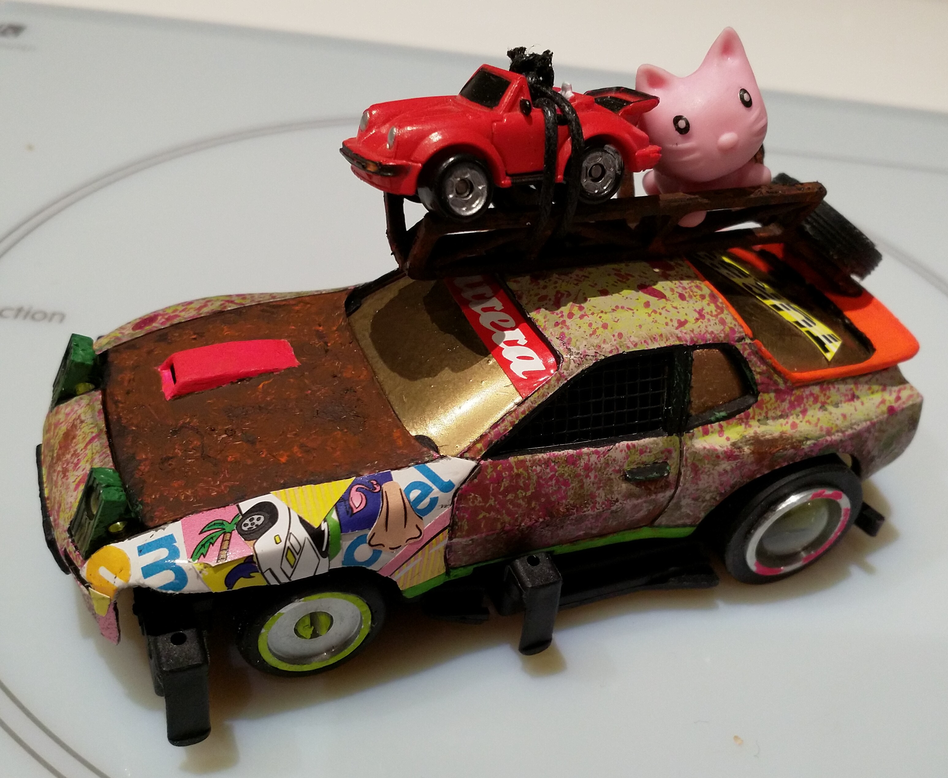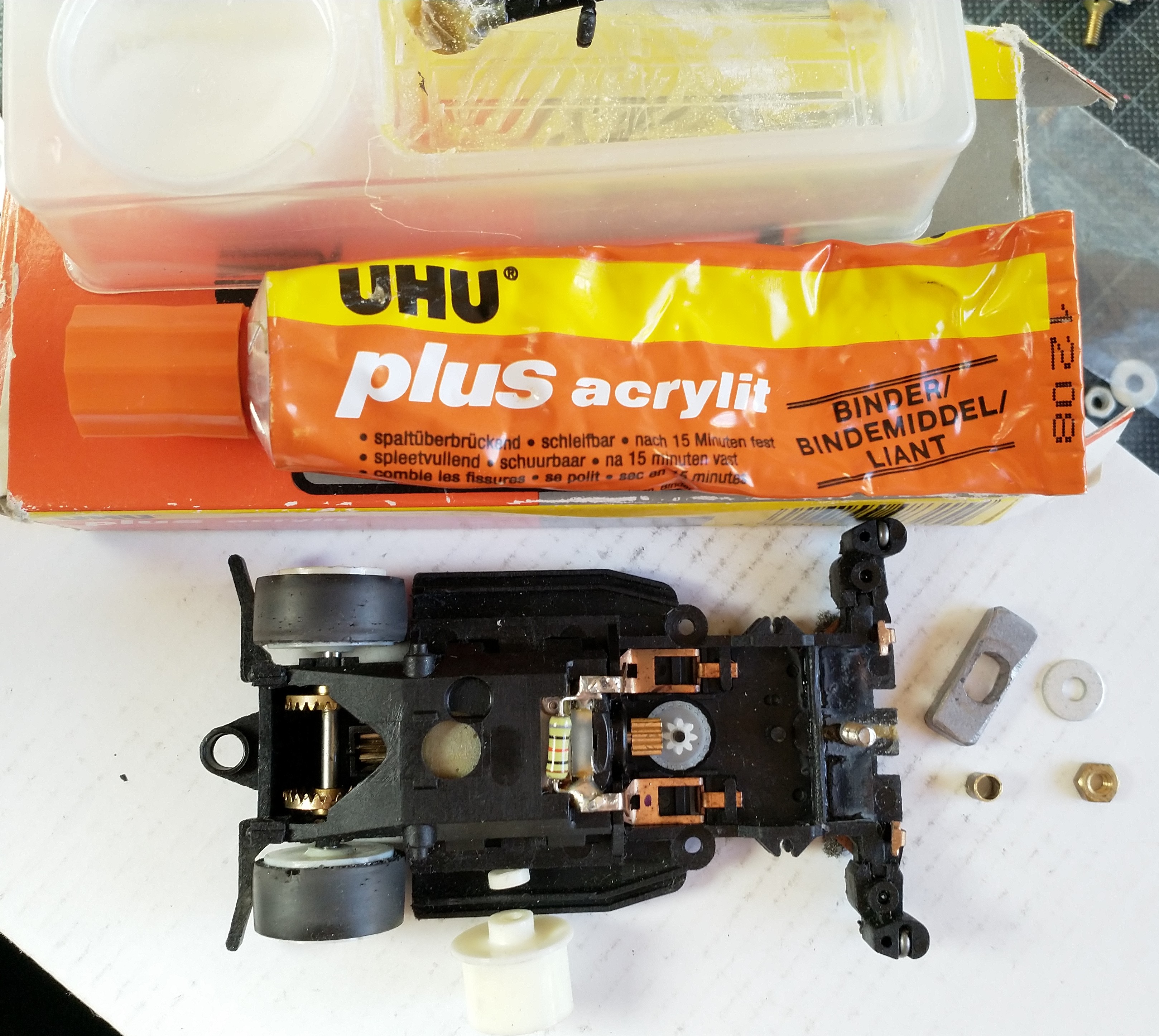 Hier mein Versuch nach der Hixman Anleitung. Ich habe die Schraube mit dem 2K Kleber auf dem Foto einzementiert. Der Kleber ist sehr empfehlenswert. Nach 15 Minuten so hart, dass man schleifen kann. Das Gewicht habe ich aus einer Druckplatte herausgeschnitten und zurechtgefeilt. Zwischen Gewicht und Schraube habe ich noch eine Messinghülse. Deutlich besseres Fahrverhalten festzustellen. Innenkurven haben aber immer noch Probleme gemacht wegen dem breiten Radstand. Die letzten V1 Chassis mit den auch in V2 verwendeten Rädern haben knapp über 50 mm Radstand und die alten mit den grauen Plastikfelgen nur 46 mm. Habe die Spurverbreiterungen abgesägt (auf dem Bild neben der ganzen Felge ist der Abschnitt zu sehen) und jetzt habe tatsächlich Mal eine Rund auf meiner Bahn am Stück geschafft. Muss mir jetzt doch Mal einen Bühler zum Vergleich anschaffen.