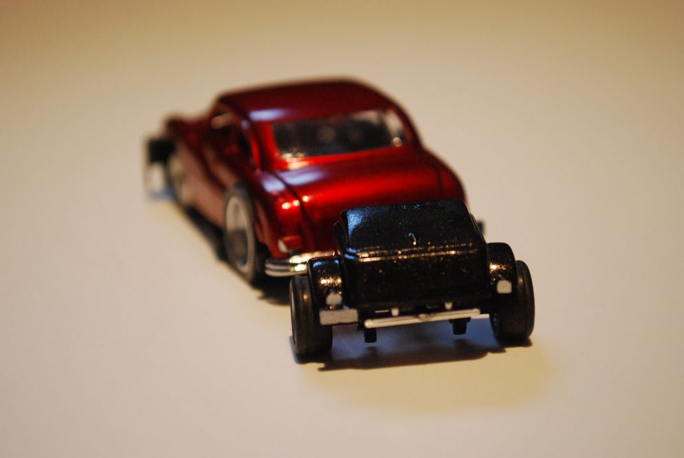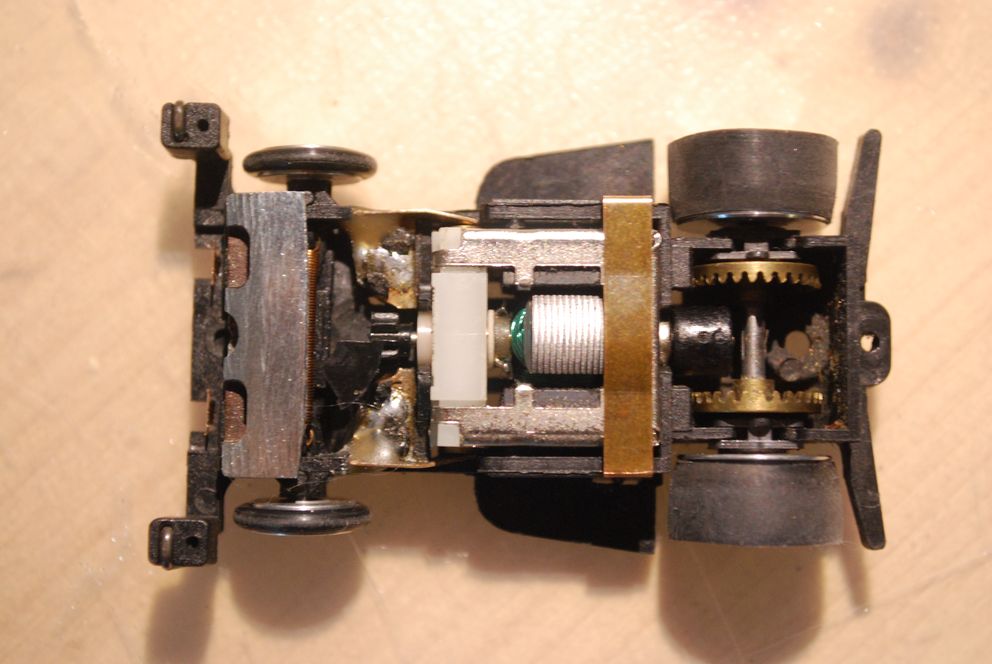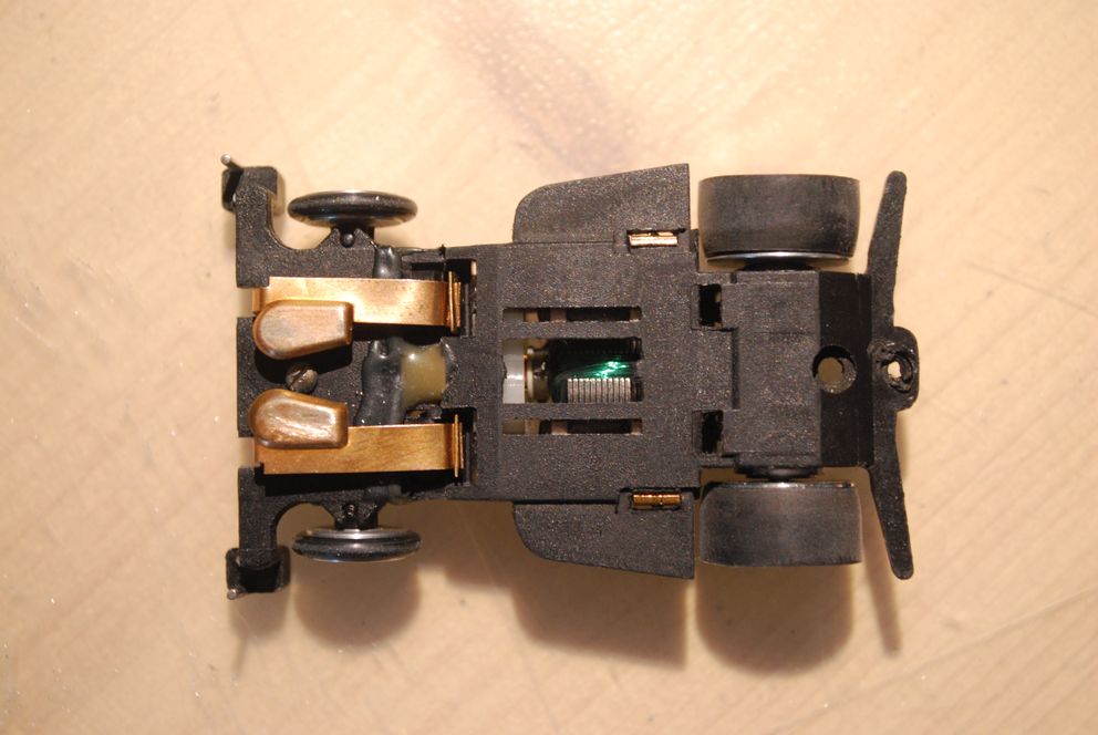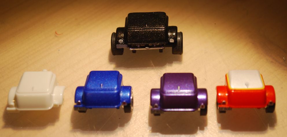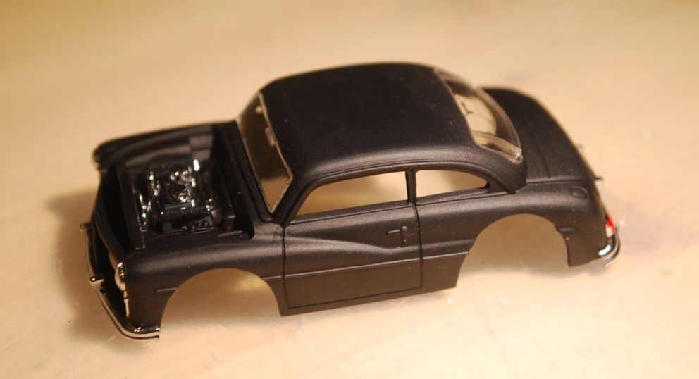 Also hab' ich aus zwei unlackierten einen breiteren hergestellt. Geklebt, gespachtelt, geschliffen. Neue Achshalterung für größere Achse drunter... Die Wagenfarbe zu treffen wäre sehr schwierig geworden, da hab' ich lieber Metallic-Schwarz genommen.