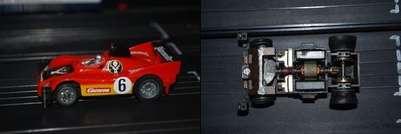 Bei den ersten Chassis wurden die Karossen aufgeklemmt, die Motoren waren offen (sog. Teilemotor) und die Chassis hatten keine seitlichen Flügel, hier ein Porsche 936 Jägermeister: Danach wurde seitens Carrera wohl registriert, dass die Chassis zum Teil in den Innenkurven mit den Hinterreifen auf den Innenführungen aufsitzen und abfliegen. Die nächsten Chassis hatten dann jedenfalls Flügel, hier ein Lola: Danach kamen dann irgendwann die Schraubkarossen und die Blockmotoren, z. B. der BMW M1: Von allen Varianten gibt es sowohl Kurz-(bzw. Normal-) als auch Langchassis. Hier ein Langchassis, BMW 633, Klemmkarosse, aber schon Blockmotor, außerdem mit Licht: Bei den Lenkungen gibt es zwei verschiedene Varianten. Die „normale“ (links im Bild) und die sog. Spreizfederlenkung (rechts, bei den neuesten Schraubkarossen): Eine gute Seite mit weiteren Beschreibungen, Fahrzeugen, Grundpackungen etc. gibt es hier: