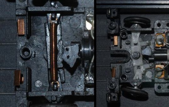 Eine Möglichkeit, dass zu verbessern ist, die Federn unter den Schleifern etwas zu dehnen. Dadurch wird der Anpressdruck der Schleifer an die Halterung vergrößert und damit die Stromaufnahme verbessert. Nachteil: Durch den größeren Druck wird das Fahrzeug quasi von der Bahn gehoben, sprich die Vorderräder haben schlechteren Kontakt. Das kann dazu führen, dass die Fahrzeuge nicht mehr so gut lenken. Dann müsste der Lenkeinschlag vergrößert werden. Führt wiederum evtl. dazu, dass die Fahrzeuge wieder langsamer werden…