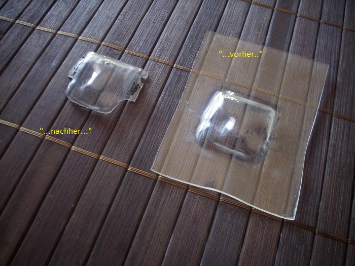 Habe es bei den 140 fürn Capri und nen Porsche schon gemacht. Also dafür auch die entsprechenden Formen. Die kann man dann so bestimmt 20-30 mal verwenden. Danach sollte man den Glaseinsatz aber nochmal mit Polierpaste bearbeiten, gibt halt doch blöde Kratzer! :frown: