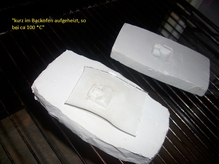 Die Formhälften kommen dann in den Ofen, nen Stück Acrylglas drauf und wenn es dann so langsam anfängt weich zu werden (ca 100*C), drücke ich die andere Form oben drauf.
