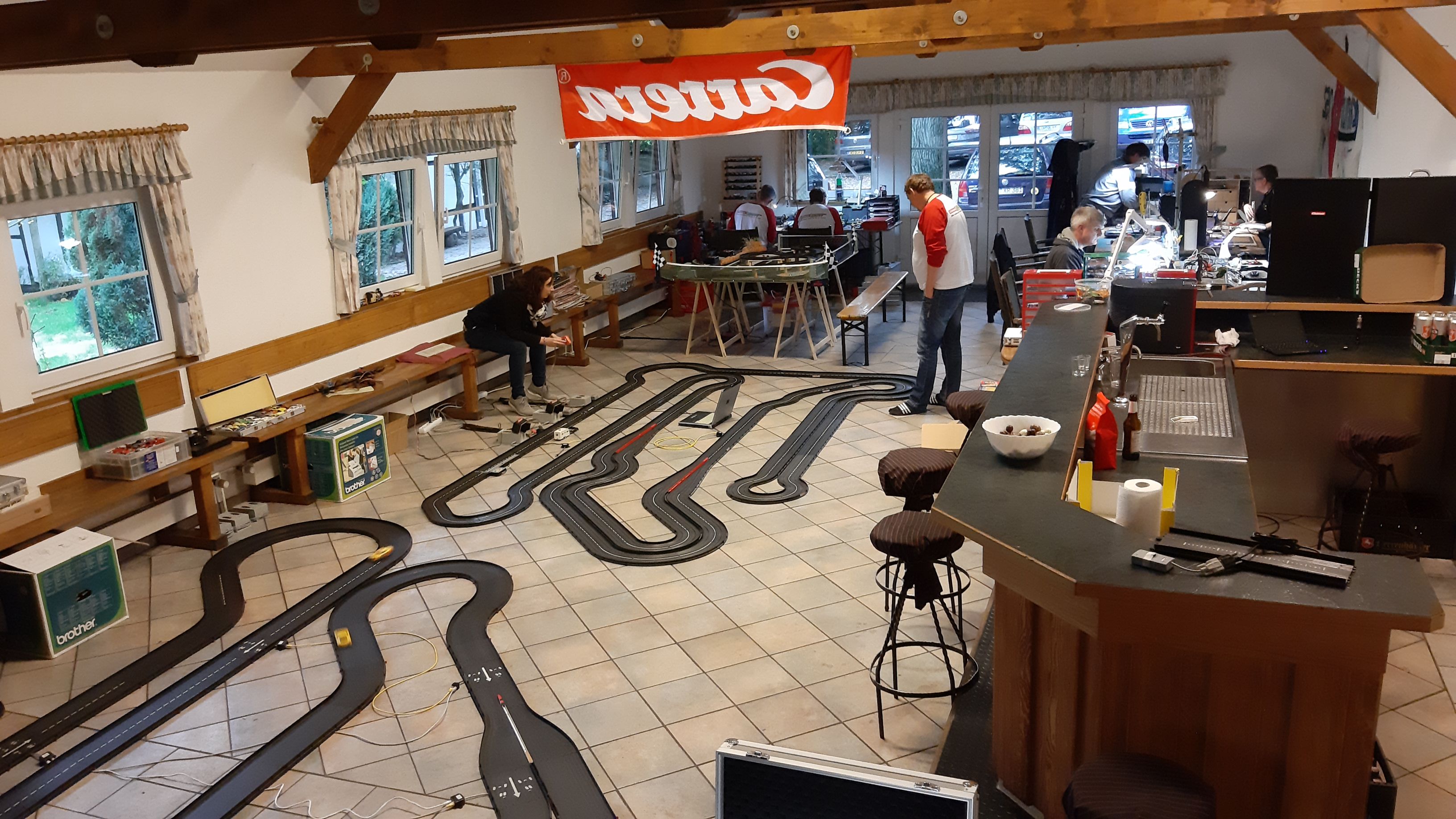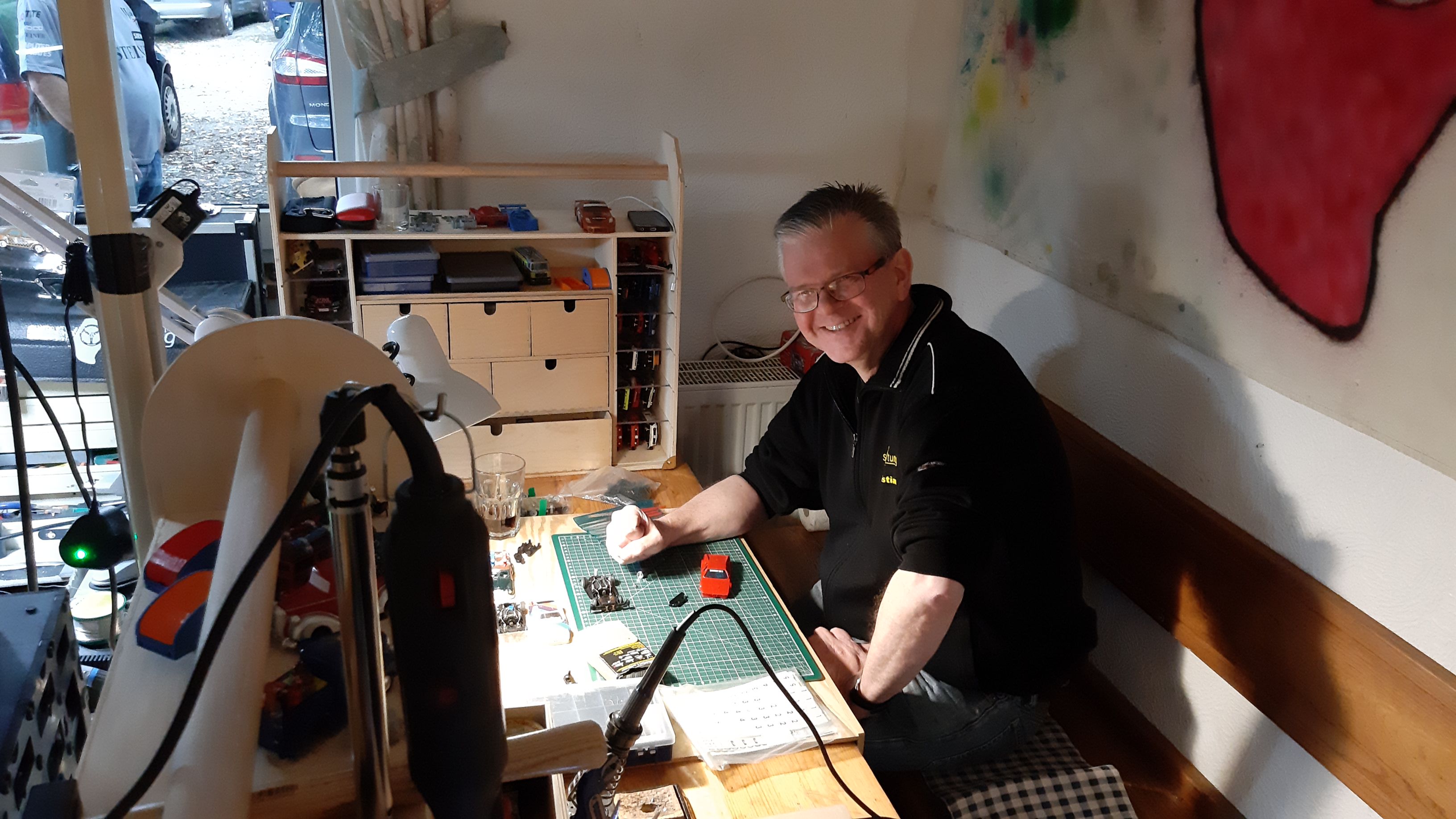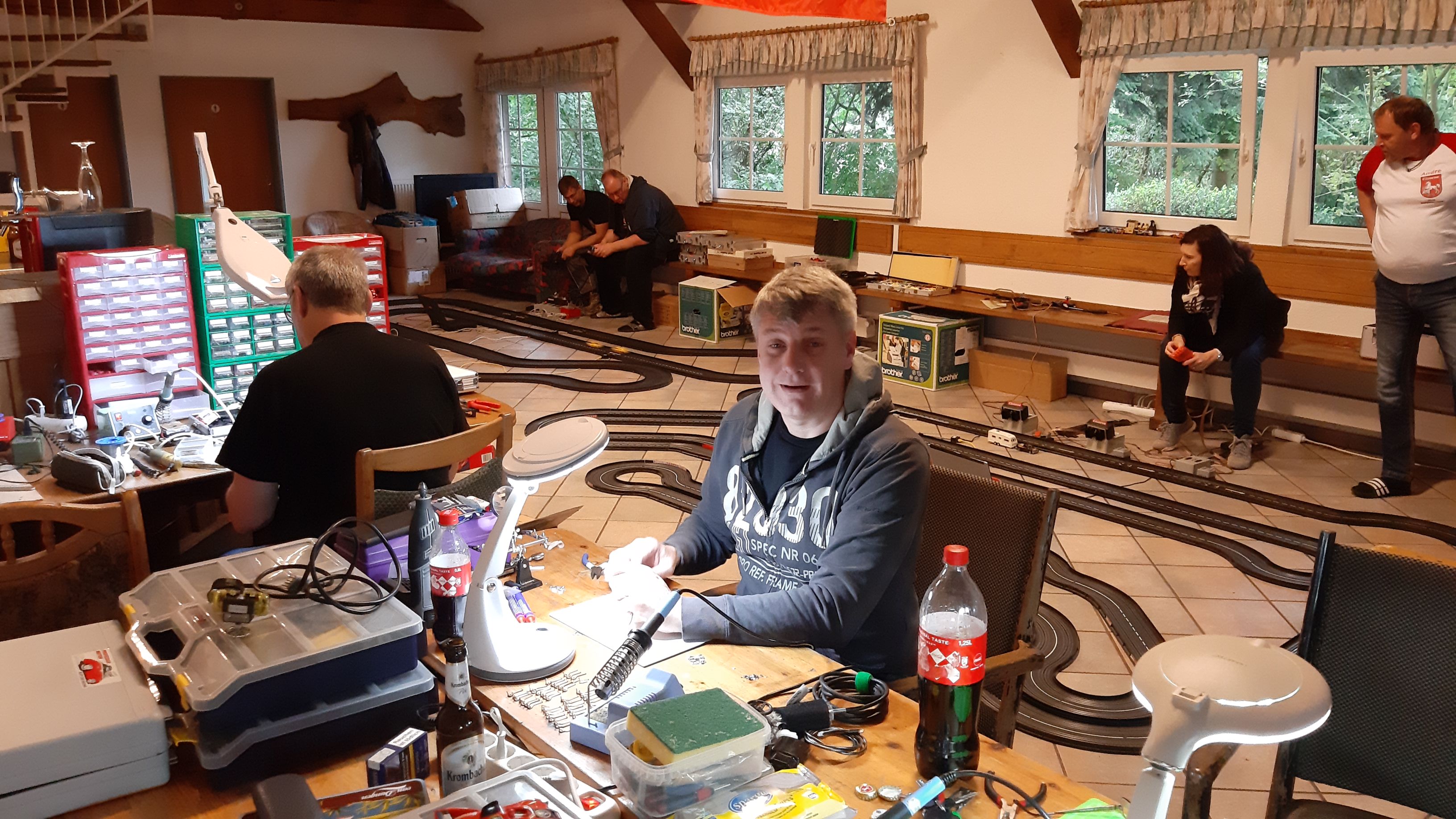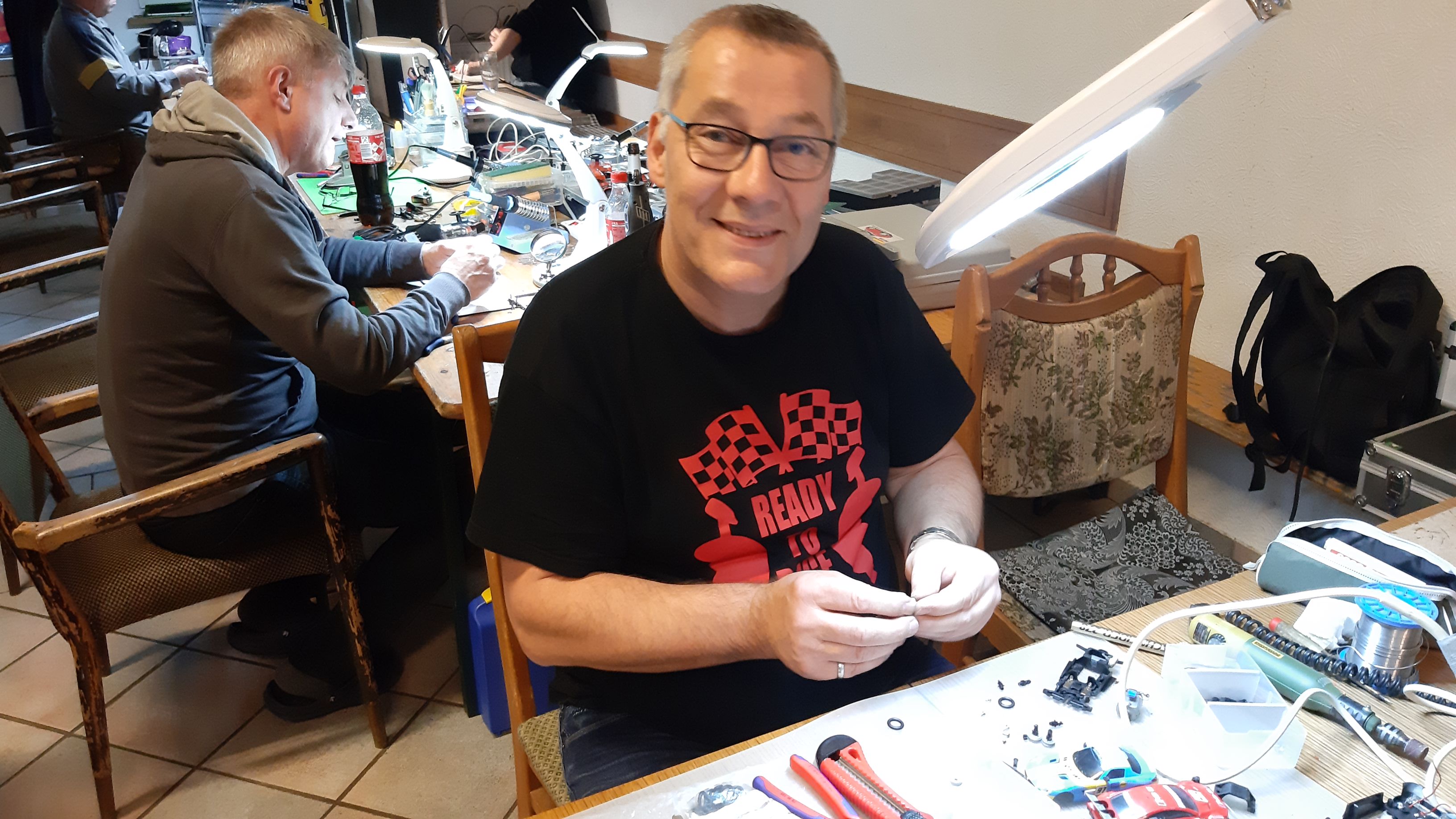 Um Basteleirückstände auf den vorhandenen Tischen zu vermeiden, wäre es gut, wenn alle Bastler sich eine entsprechende Unterlage mitbringen könnten (z.B. ein Brett oder Pappe auf dem man löten, kleben, dremeln und lackieren kann.)