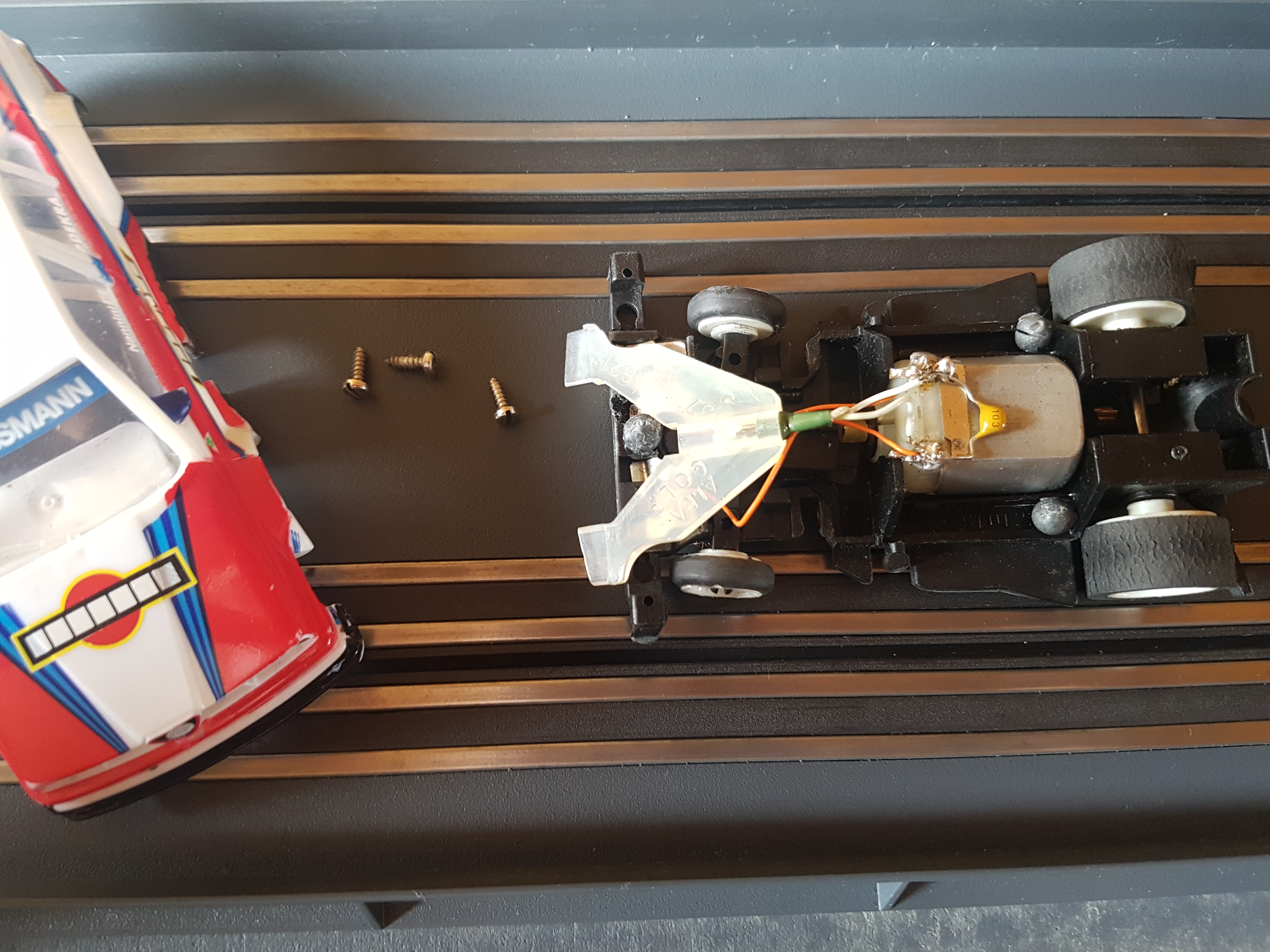 Gute V1-Autos brauchen kein Gewicht. Man kann noch ganz dezent mit Magneten hinten arbeiten, wenn man das möchte, aber selbst das ist mit den richtigen Reifen unnötig.